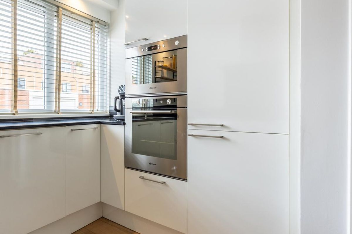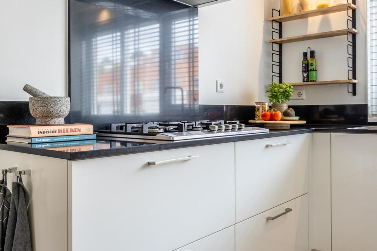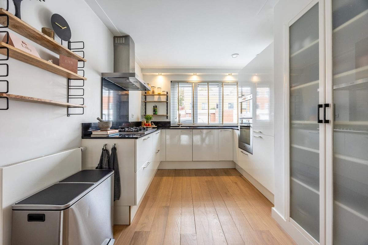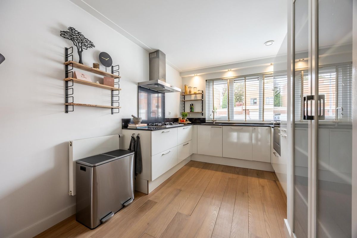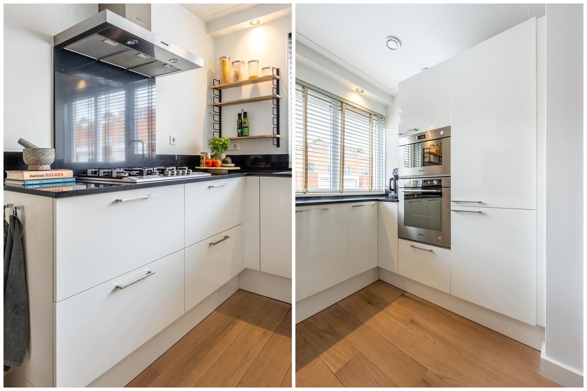 Aan de voorzijde ligt de open keuken in U-opstelling, voorzien van diverse inbouwapparatuur, waaronder een gaskookplaat, afzuigkap, oven, magnetron, koel-vriescombinatie en vaatwasser. Er is voldoende kastruimte.