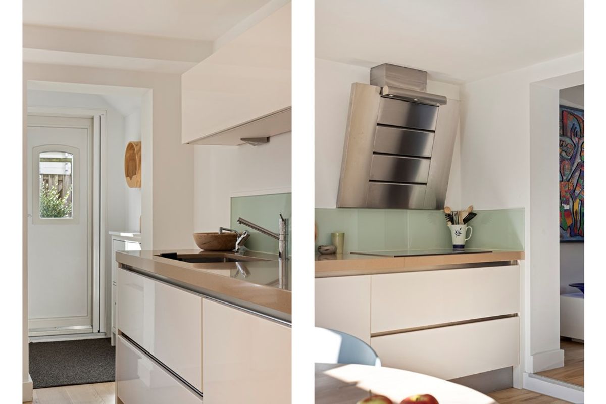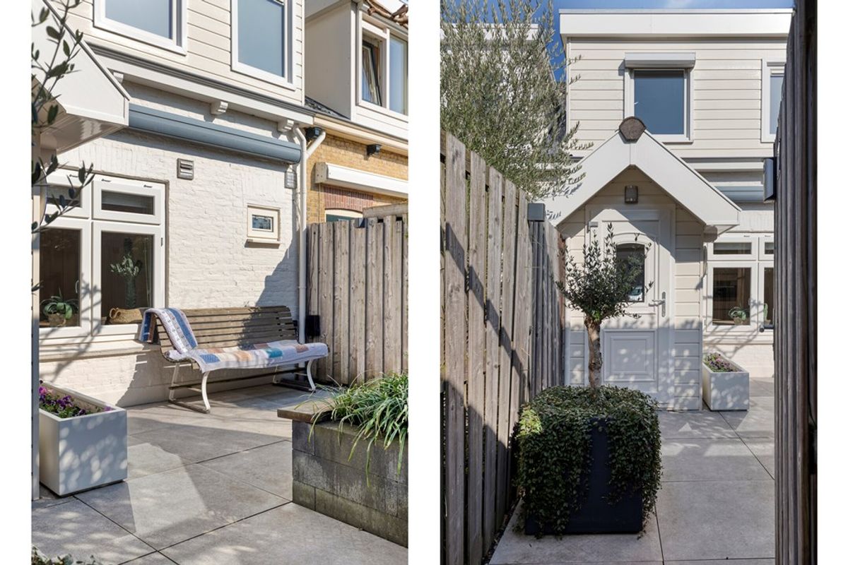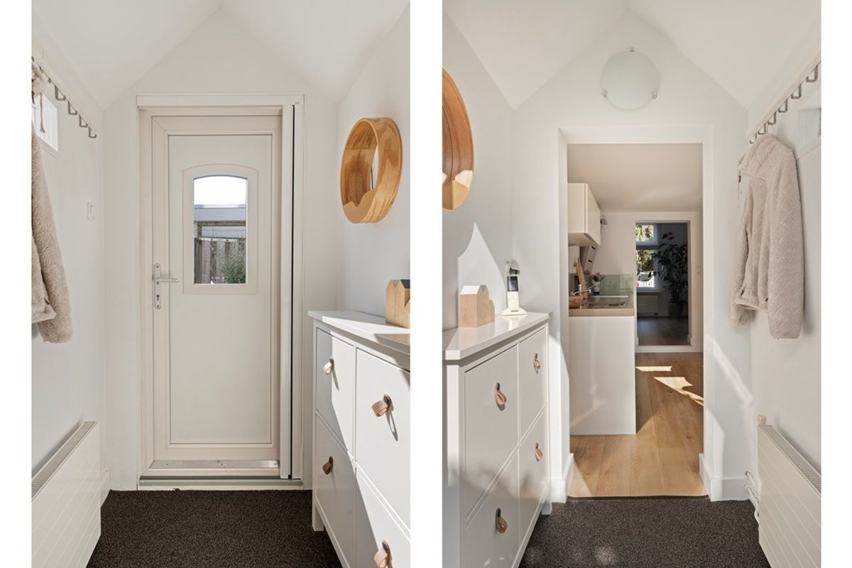 De entree van de woning is via de sfeervolle achtertuin. Via de hal heb je toegang tot de keuken.