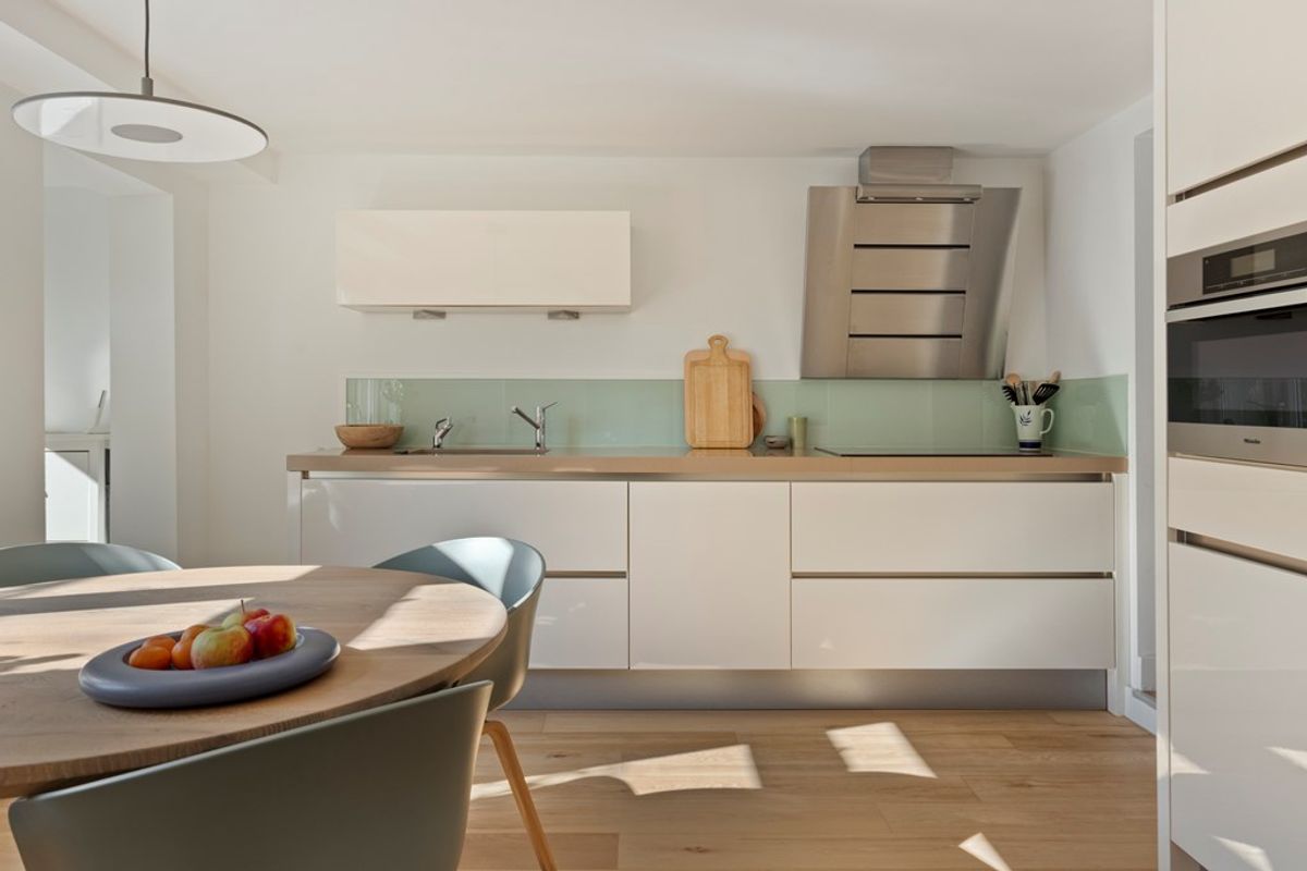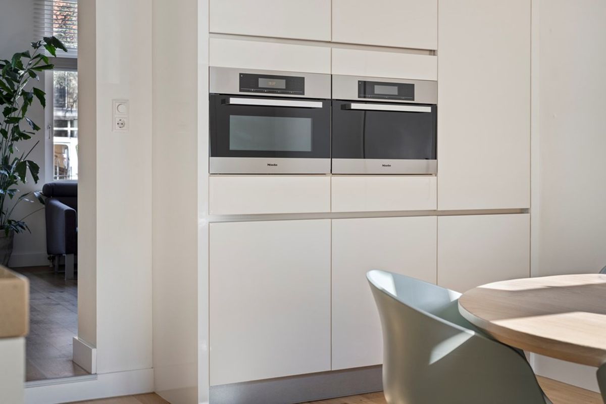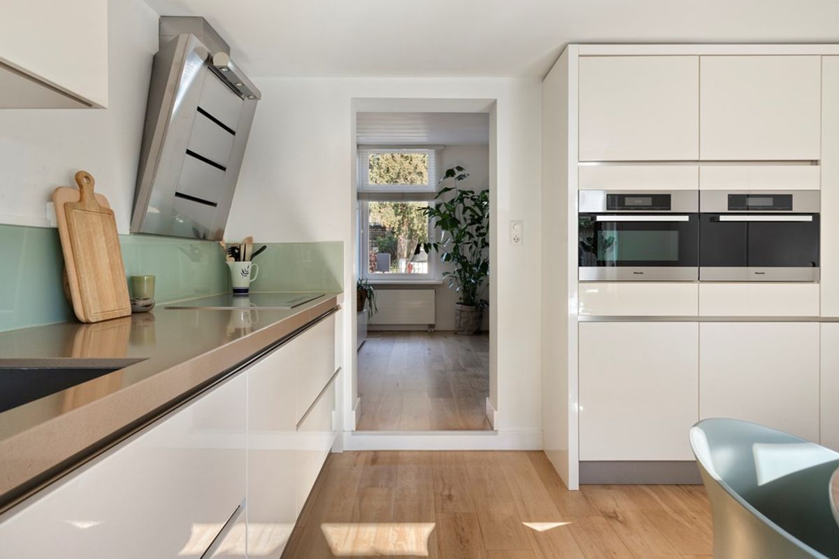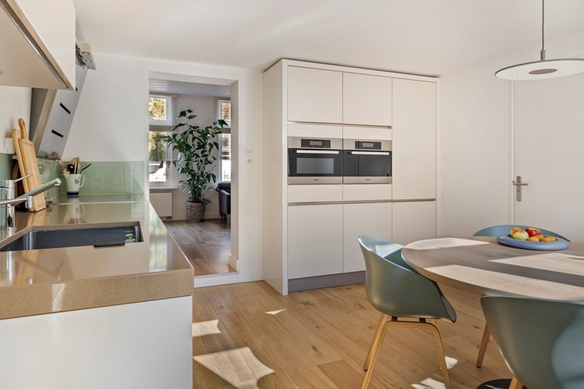 Een luxe ,ruime en lichte woonkeuken met diverse inbouwapparatuur en voldoende ruimte voor de eettafel.