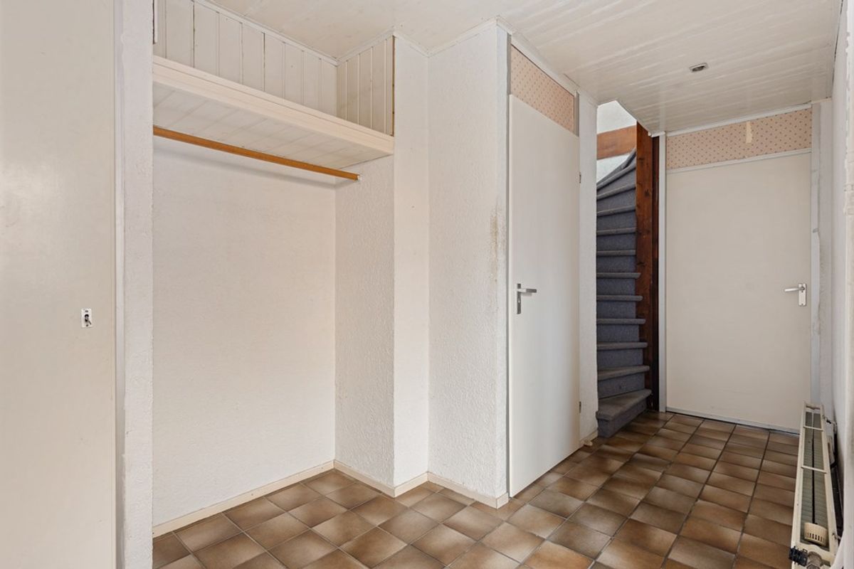 You enter through a spacious hallway. Immediately on the left, you have access to the garage—ideal for a car, bicycles, or extra storage. Continuing through the hallway, you’ll find the toilet on the left and the staircase to the first floor.