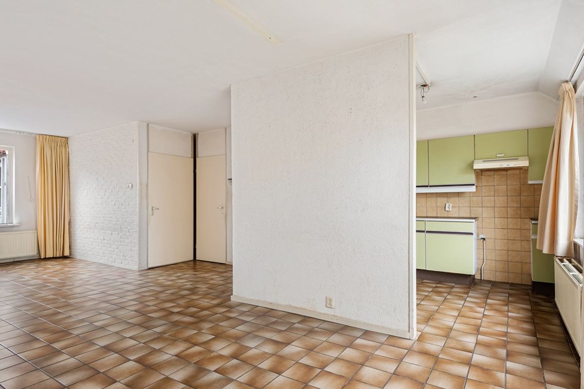 Achterin de woonkamer vind je aan de linkerkant de keuken, uitgerust met een wasbak, kraan en afzuiging.