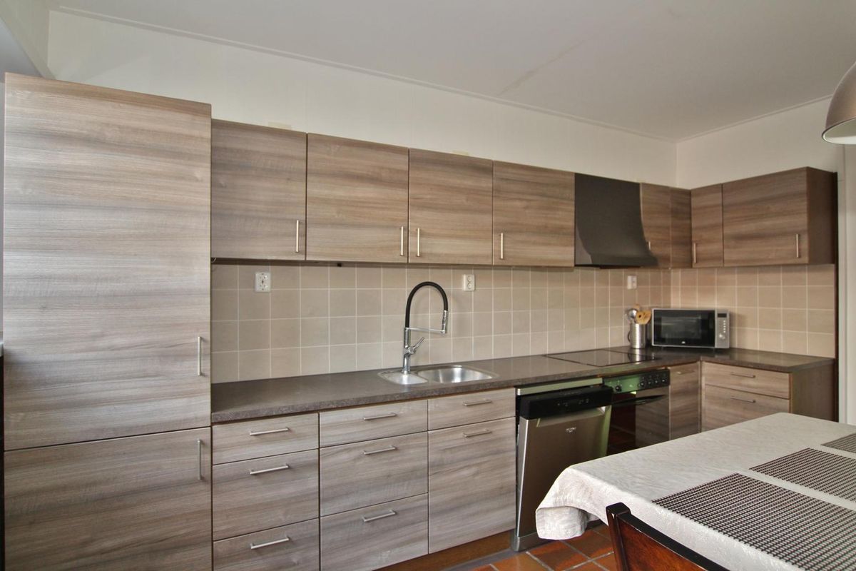 De dichte keuken (ca. 6,90 x 2,50 m) beschikt over diverse inbouwapparatuur: koel-/vriescombinatie, oven, elektrische kookplaat, afzuigkap en close-in boiler.