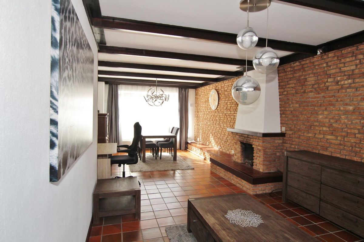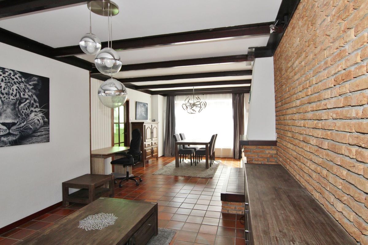Via de hal met tegelvloer bereik je de kelderkast, meterkast, het toilet en de trap naar de verdieping. De ruime woonkamer (ca. 9,00 x 4,00 m) is voorzien van een tegelvloer, schouw met gasaansluiting en rolluiken.