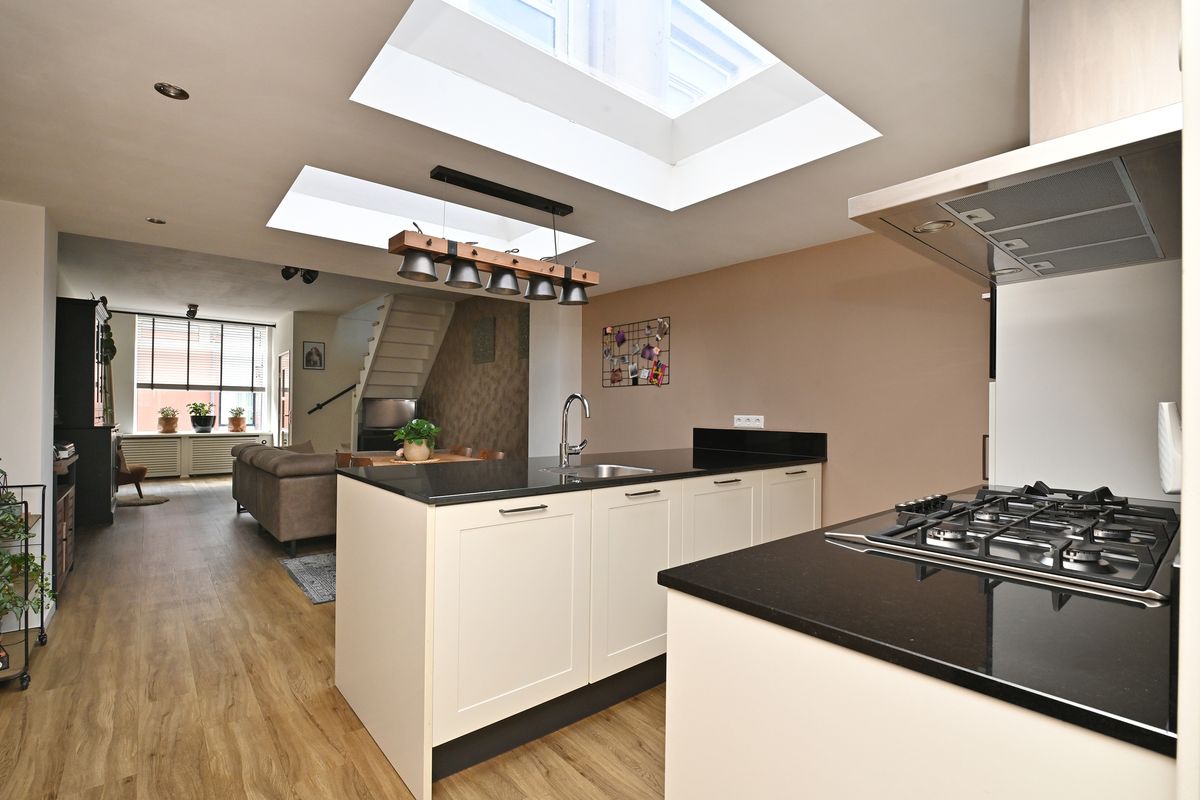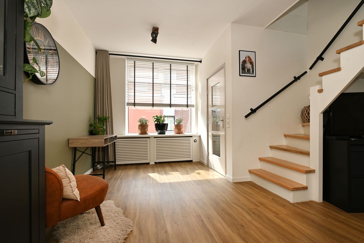 De doorzonwoonkamer is ruim en licht, voorzien van vloerverwarming, PVC vloer, strak stucwerk en een stijlvolle industriële trapopgang (geplaatst in 2018). Vanuit de woonkamer is de moderne open keuken bereikbaar.