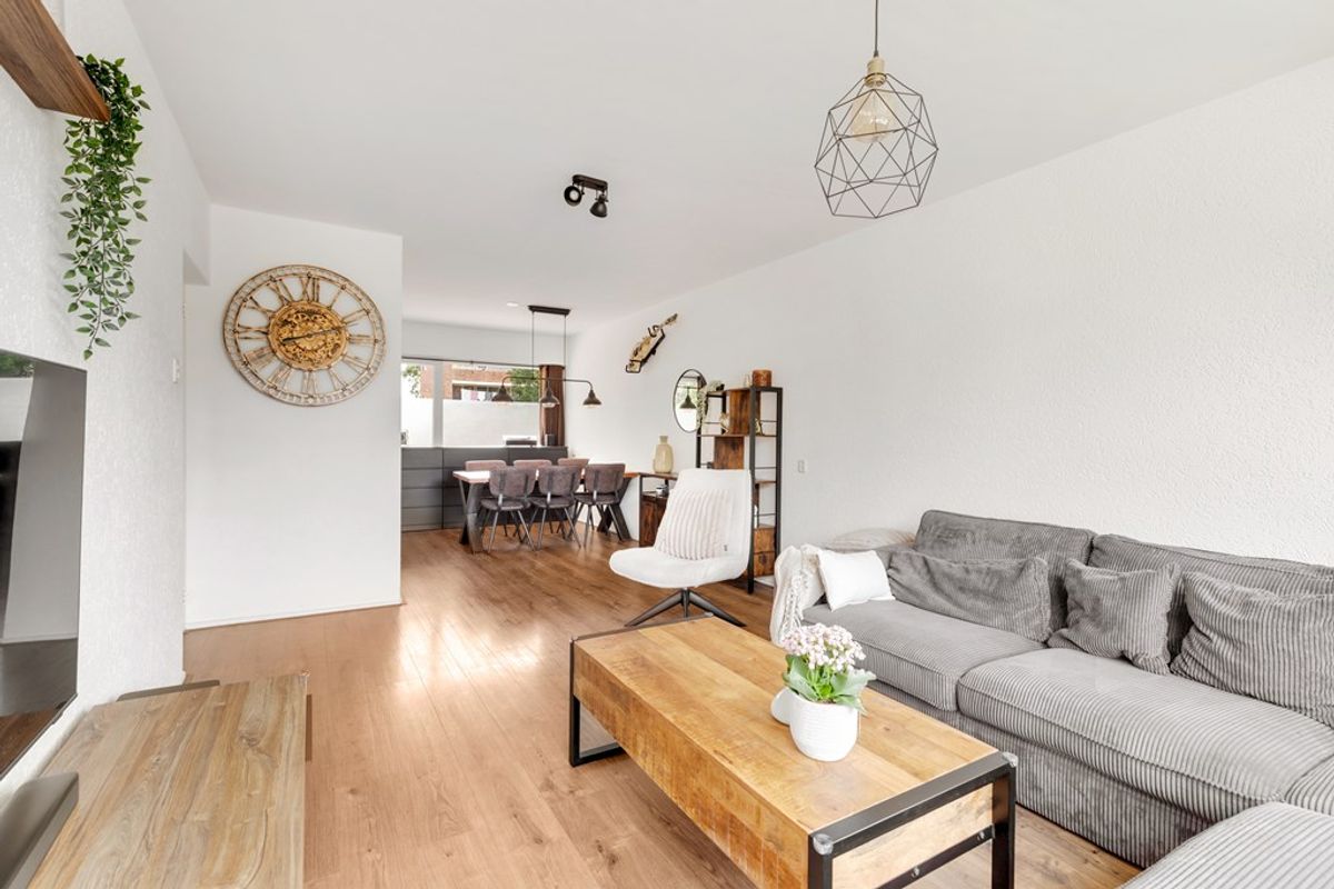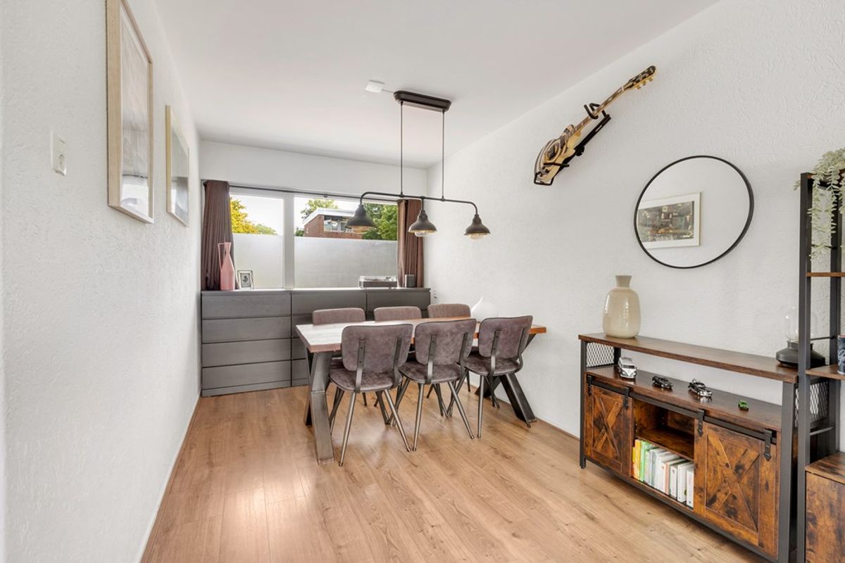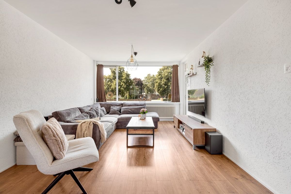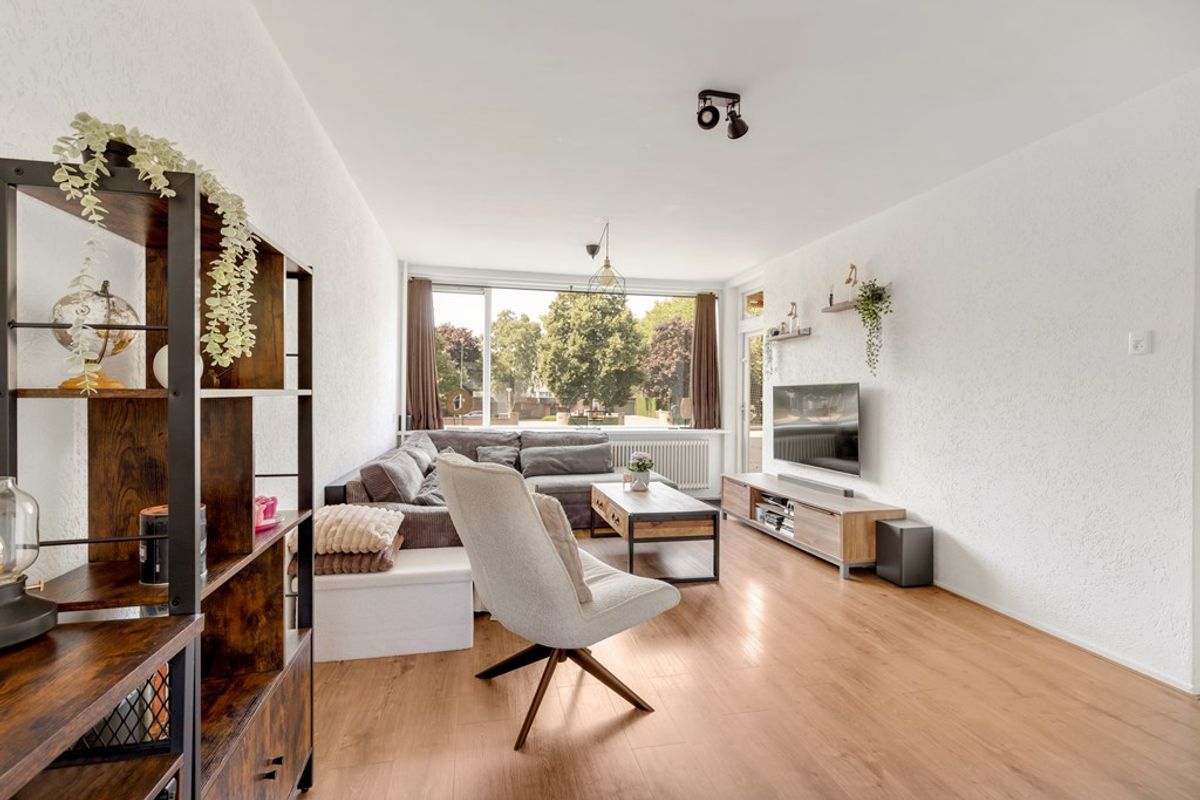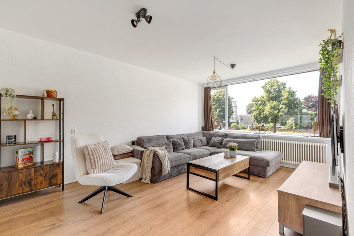 De lichte doorzon woonkamer van ruim 29 m² is voorzien van een laminaatvloer en heeft aan de achterzijde toegang tot het balkon van ruim 5 m². Aan de voorzijde loopt de woonkamer door in de eetkamer.