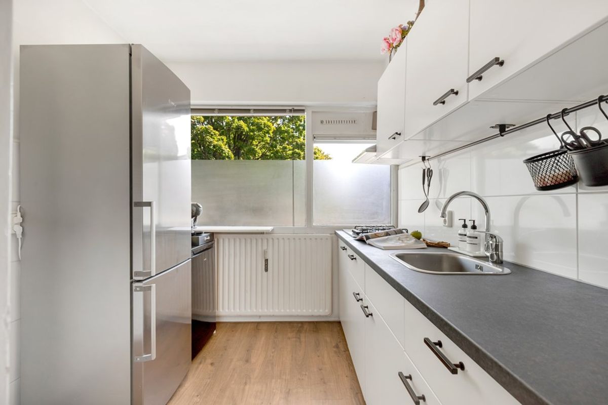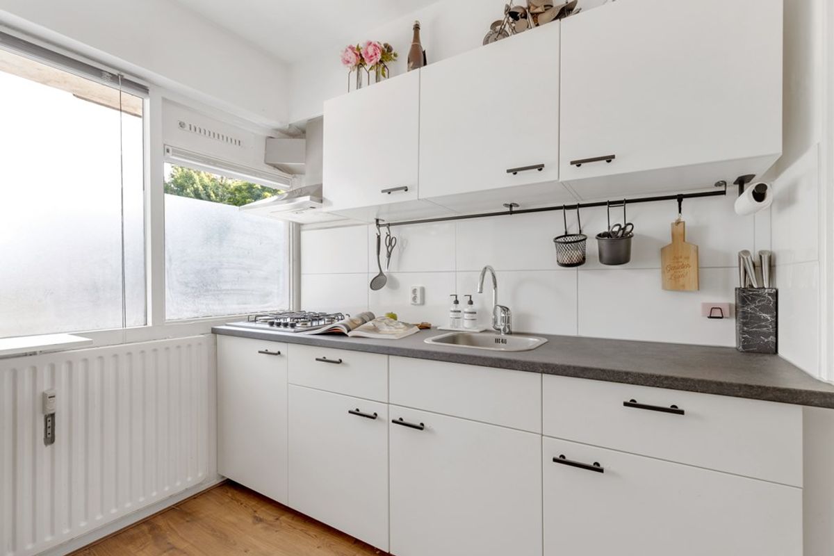 De keuken van ruim 6 m² is voorzien van een 4-pits fornuis en een afzuiger. Verder bevindt zich in de keuken nog een provisiekast en is er toegang tot de bijkeuken, met daarin een wasmachine-/droger aansluiting en de warmwater geiser. Tevens is er achter de wasmachine/droger een extra in-/uitgang vanuit de bijkeuken naar de galerij. Ook in de keuken ligt dezelfde laminaatvloer.