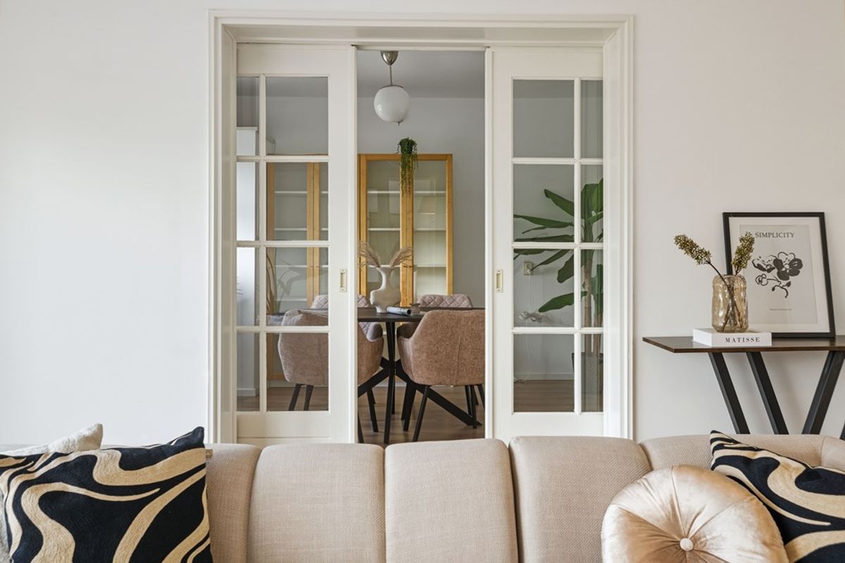 Upon entering, you step into the hallway which provides access to the various rooms. The living room is spacious and filled with natural light. The dining room is connected through beautiful authentic sliding doors, creating a charming and characteristic transition between the spaces.