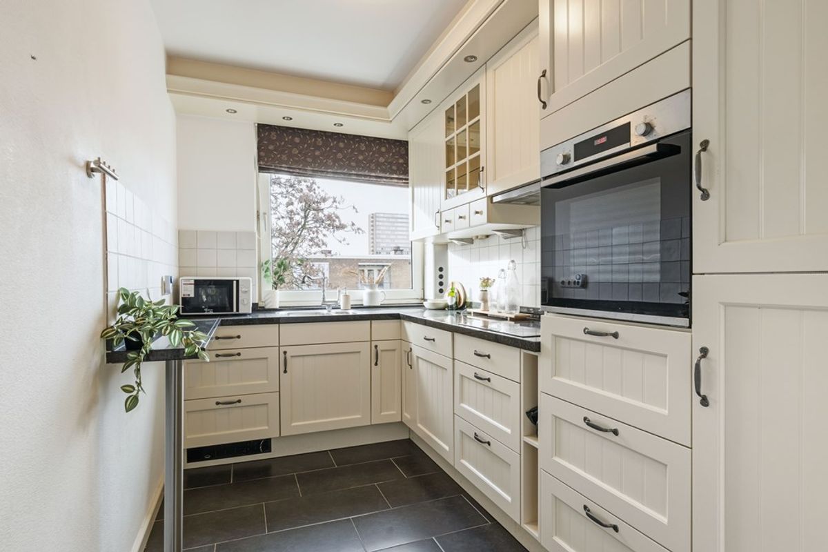 De keuken is modern ingericht en voorzien van een kookplaat, koelkast en oven. Praktisch en functioneel ingedeeld met voldoende werkruimte.