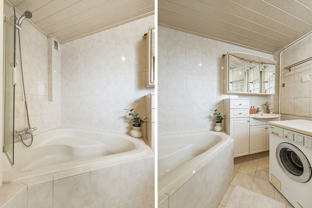 The bathroom features a large bathtub with shower function and a washbasin.