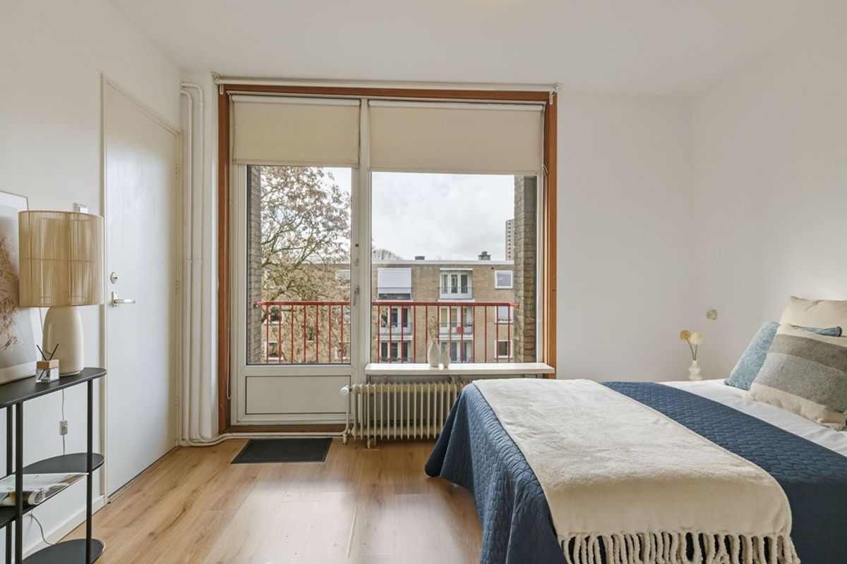 Het appartement beschikt over twee slaapkamers. De master bedroom heeft directe toegang tot het balkon aan de oostzijde. De tweede slaapkamer is geschikt als werkruimte, logeerkamer of kinderkamer.