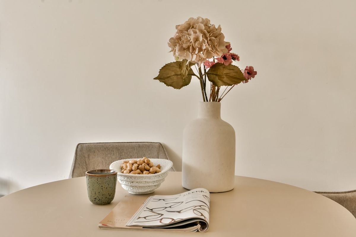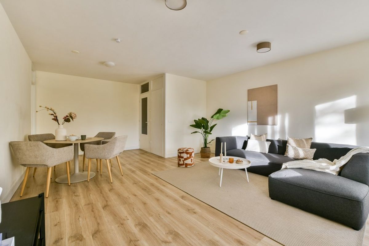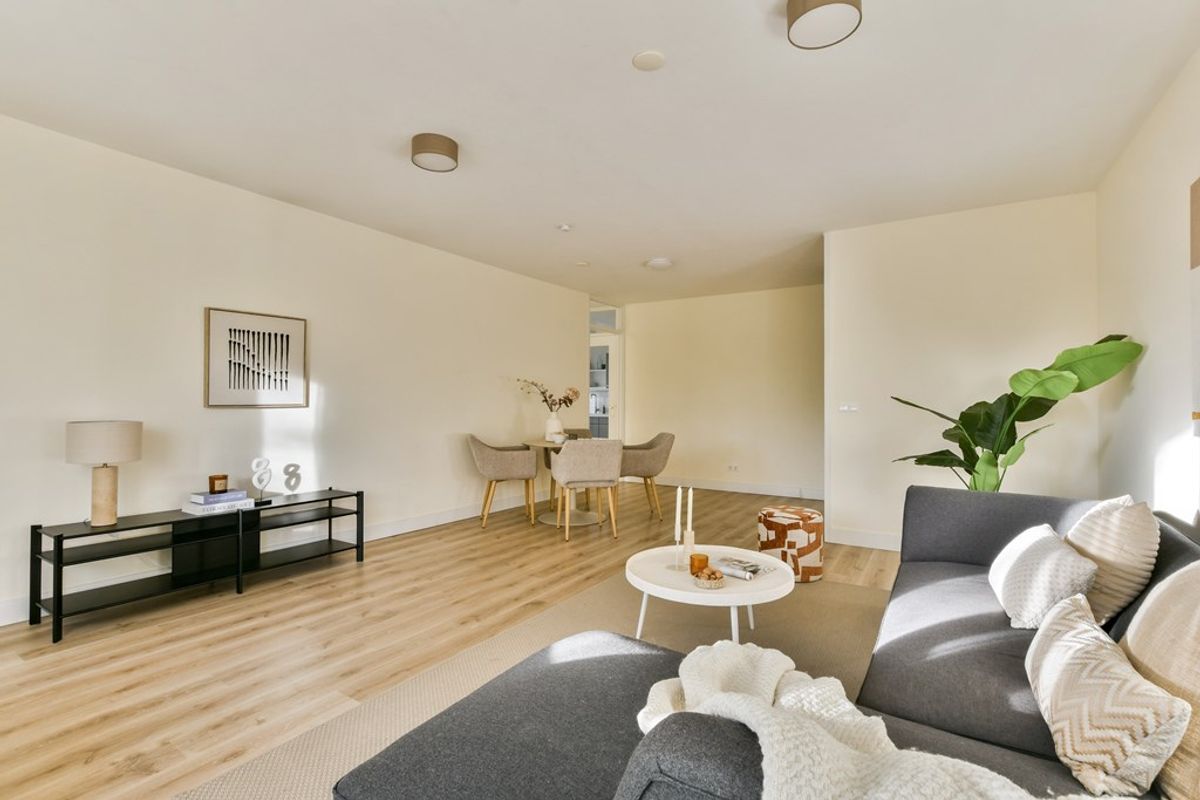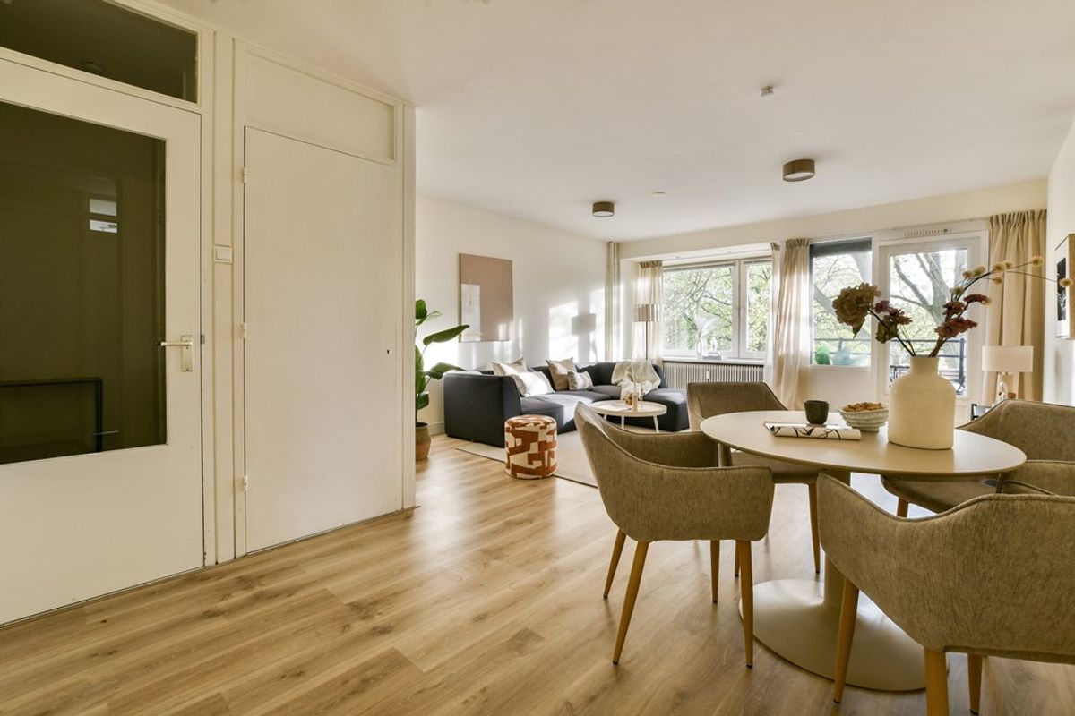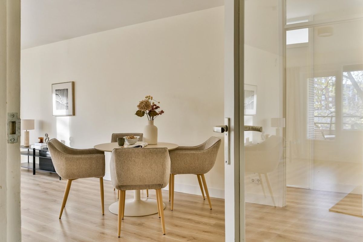 De woonkamer is royaal van formaat en biedt ruimte aan zowel een comfortabele zithoek als een grote eettafel. Dankzij de hoekligging en de brede raampartijen valt er de hele dag door veel licht naar binnen. Het uitzicht over het omliggende groen versterkt het gevoel van ruimte en rust. Vanuit de woonkamer stap je direct het eerste balkon op — ideaal om te genieten van de middag- en avondzon.