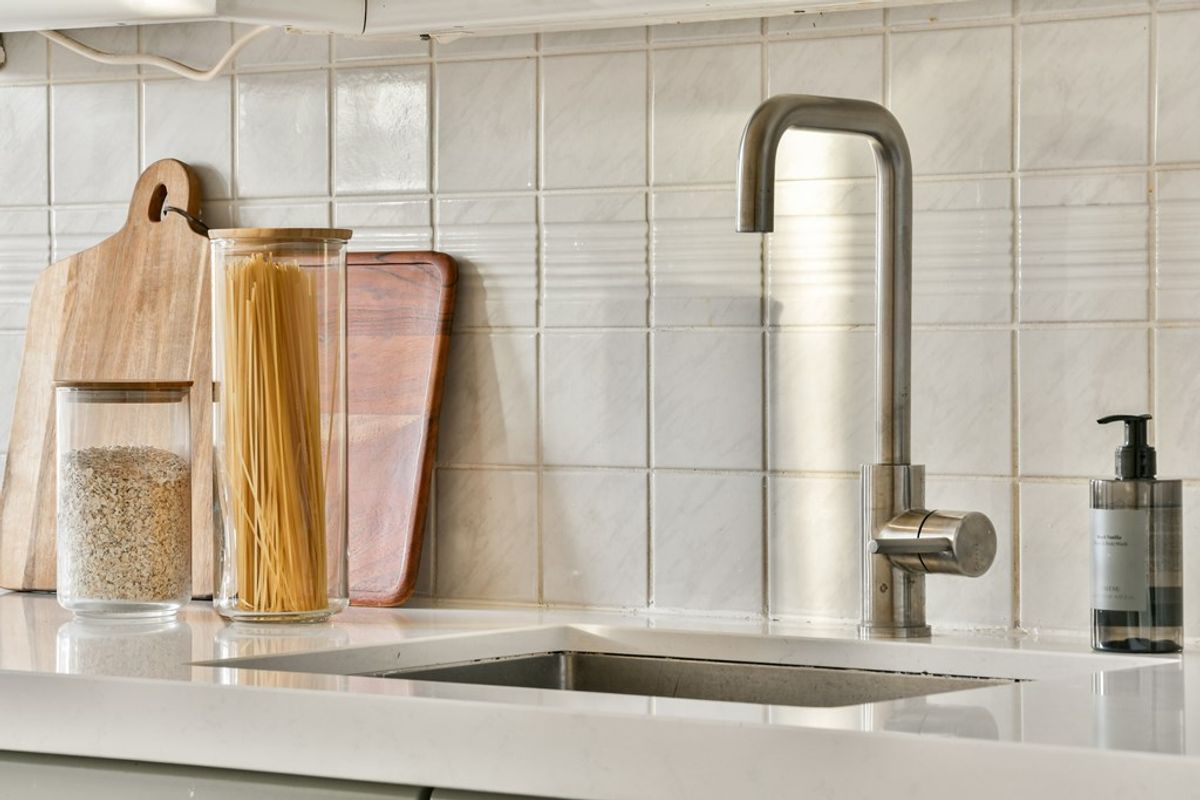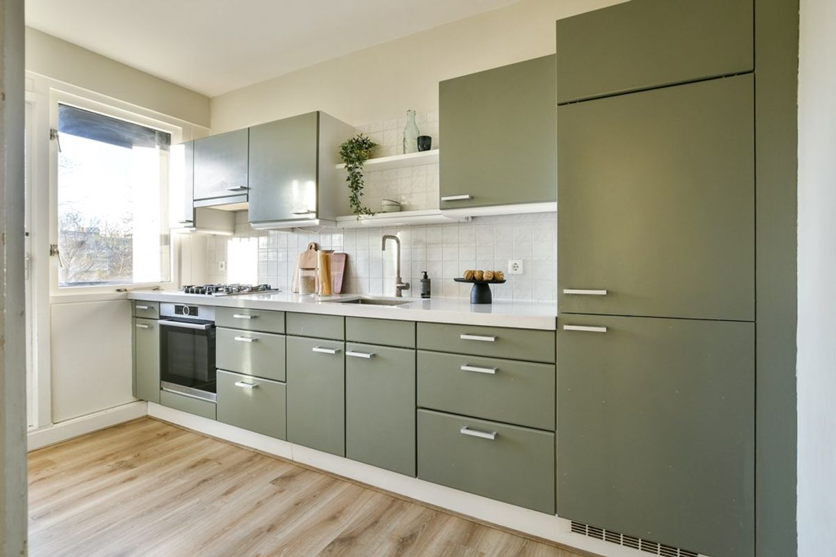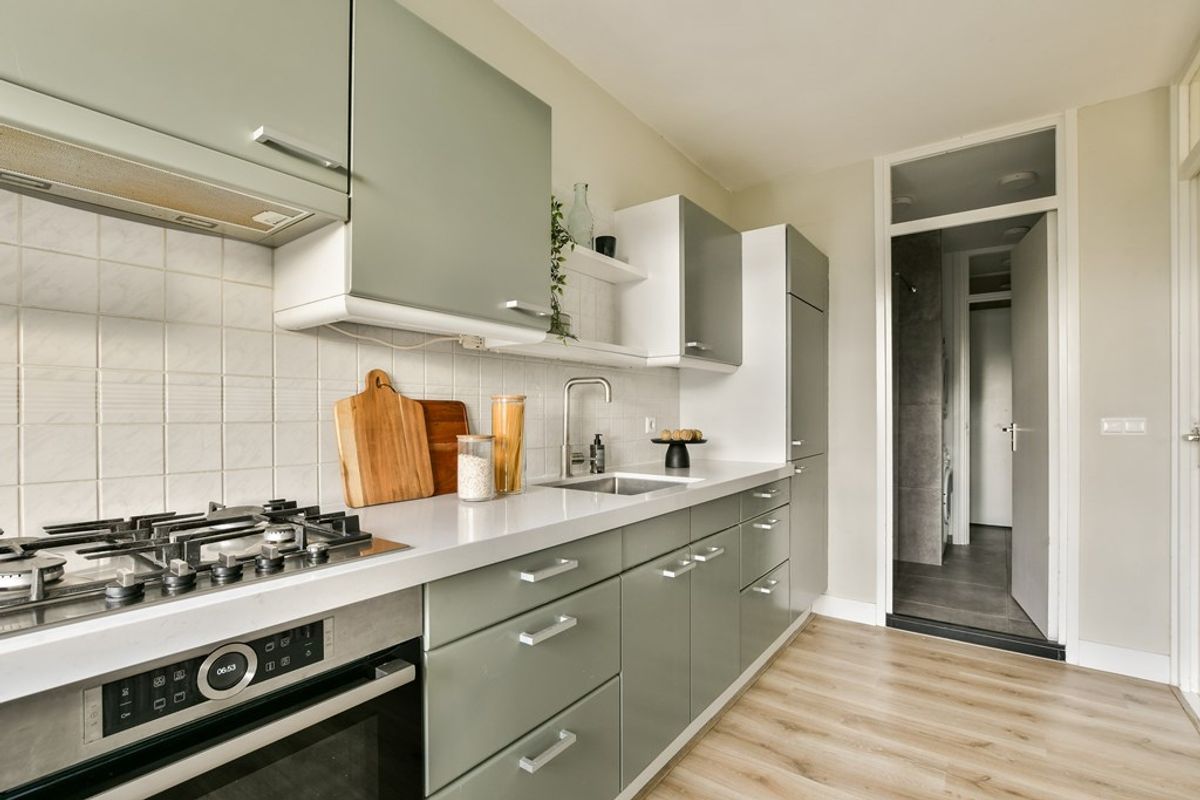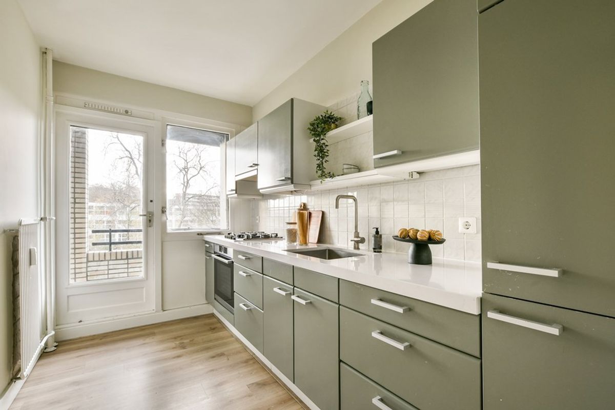 De keuken, gesitueerd aan de andere zijde van de woning, grenst aan het tweede balkon op het oosten, waar de ochtendzon prettig binnenvalt. De keuken is functioneel en biedt volop mogelijkheden om te moderniseren tot een eigentijdse woonkeuken met uitzicht over het groen.