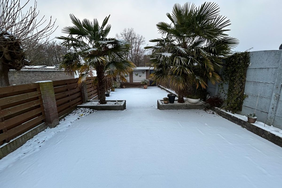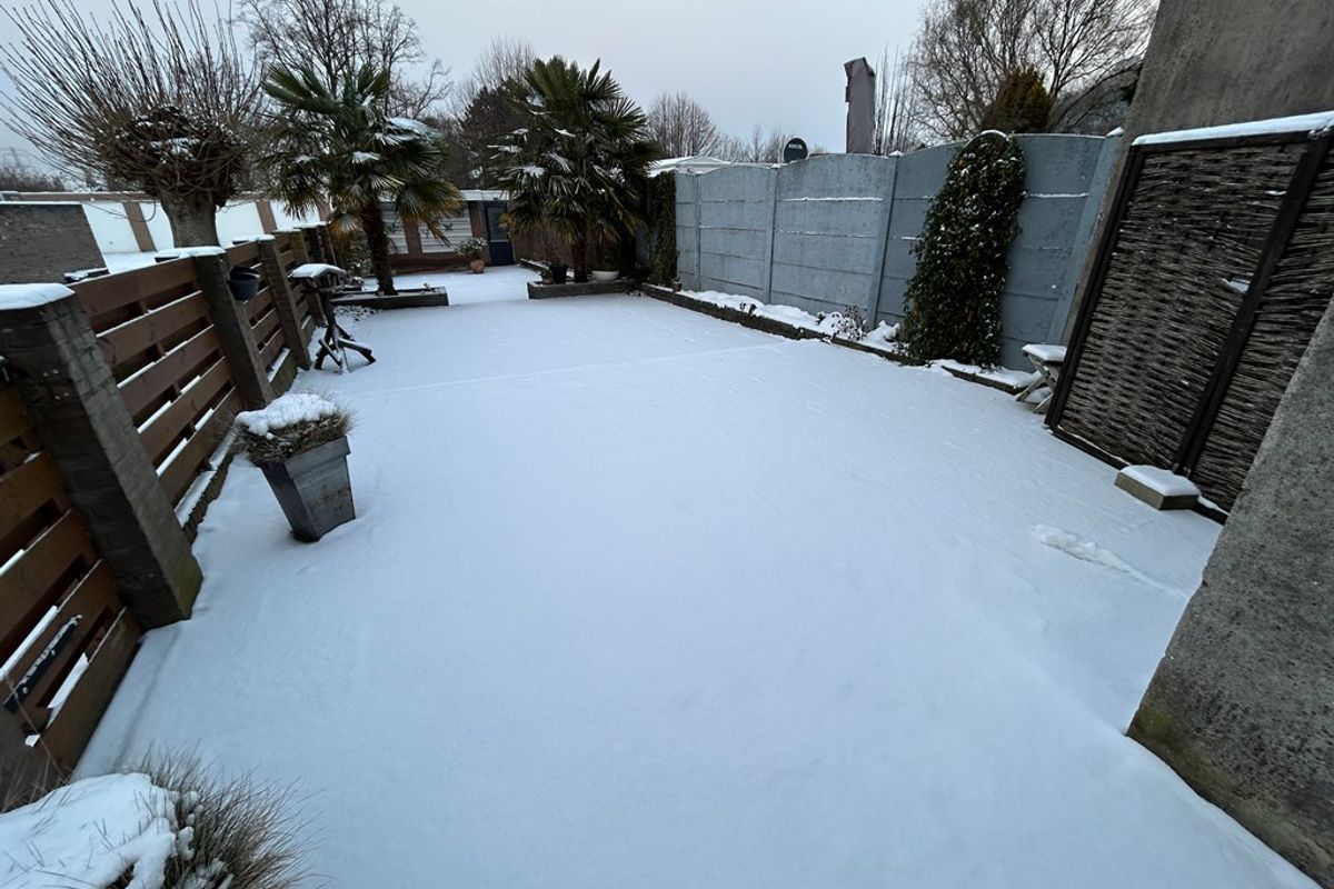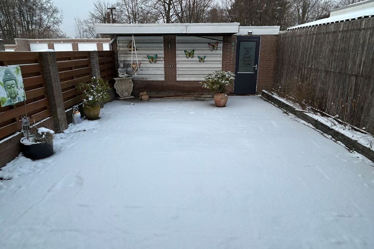 Diepe achtertuin met bestrating, beplanting, schuttingen, buitenberging 2,90 x 1,80 met cv-combiketel Remeha Calenta en vrijstaande garage 5,70 x 3,20 met elektrische poort.