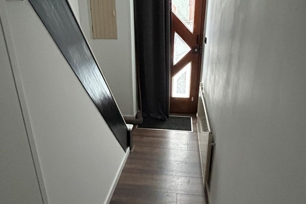 Entree/gang 3,60 x 0,90 met laminaatvloer, nieuwe meterkast met slimme meters, deur naar woonkamer en kelder en trap naar verdieping.