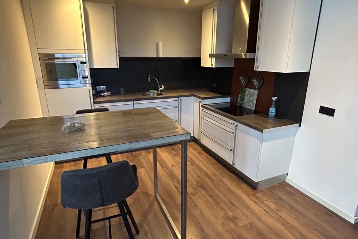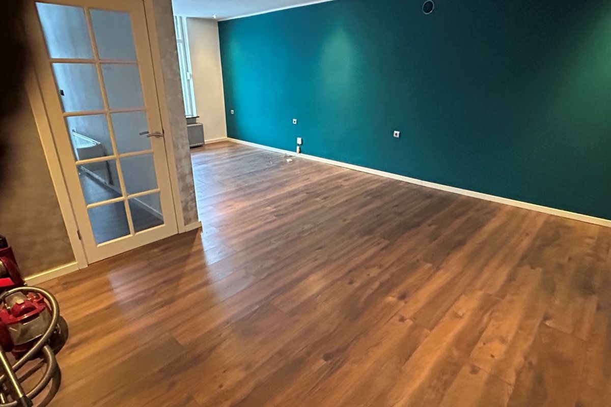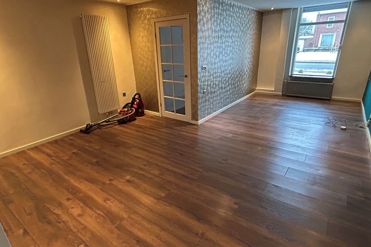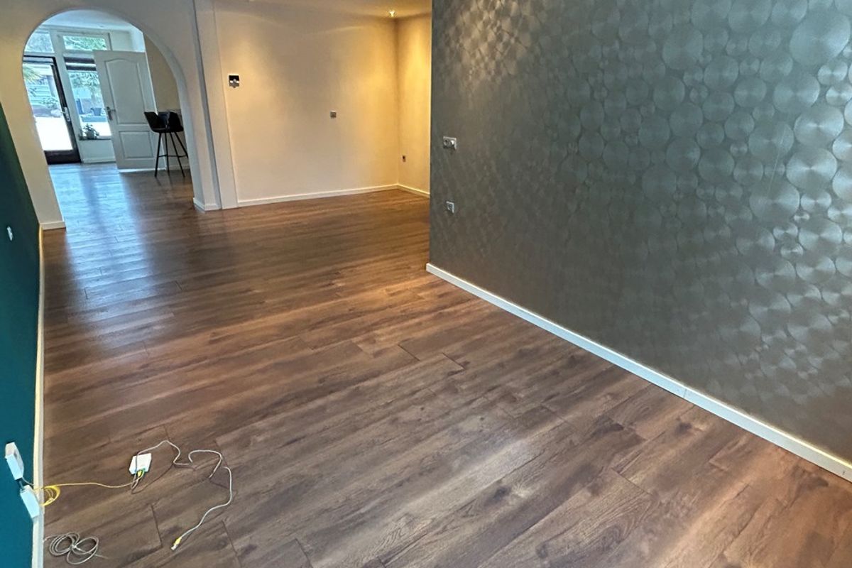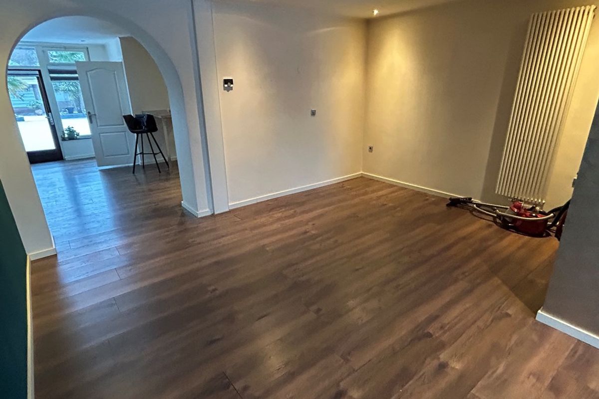 L-vormige woonkamer 7,05 x 4,80/2,85 met laminaatvloer, inbouwspots en doorgang naar keuken.