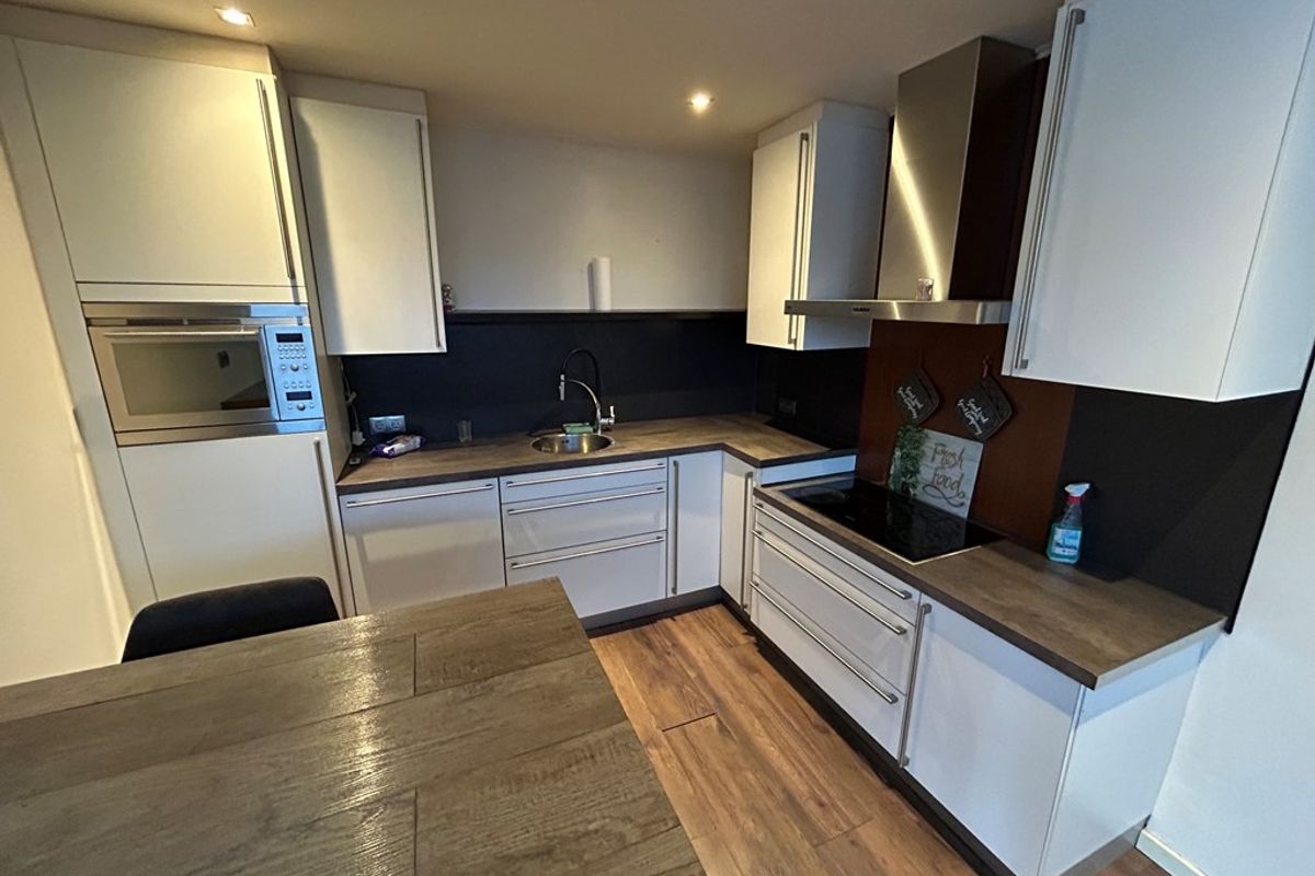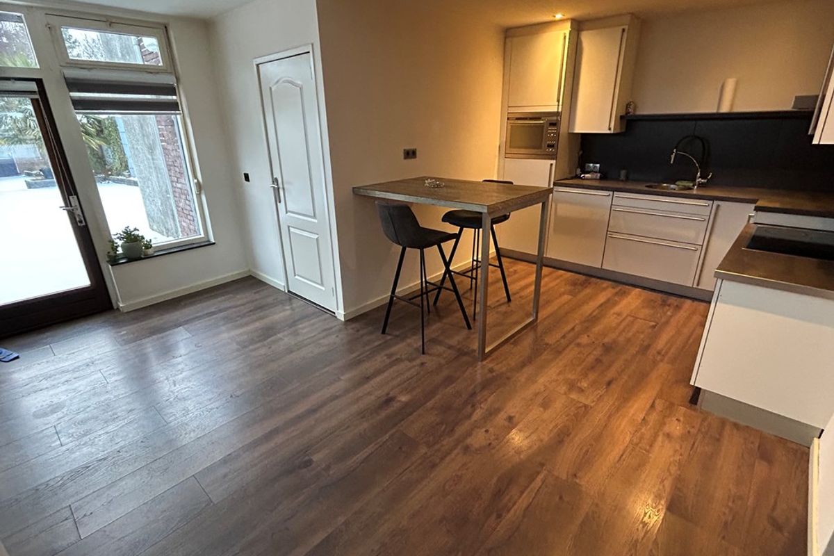 Keuken 5,10 x 3,65/1,70 met laminaatvloer, inbouwspots, deur naar portaal en achtertuin en aanbouwkeuken met elektrische kookplaat met RVS/afzuigunit, vaatwasser, koelkast, combi-magnetron, draaideurcarrousel en spoelbak.
