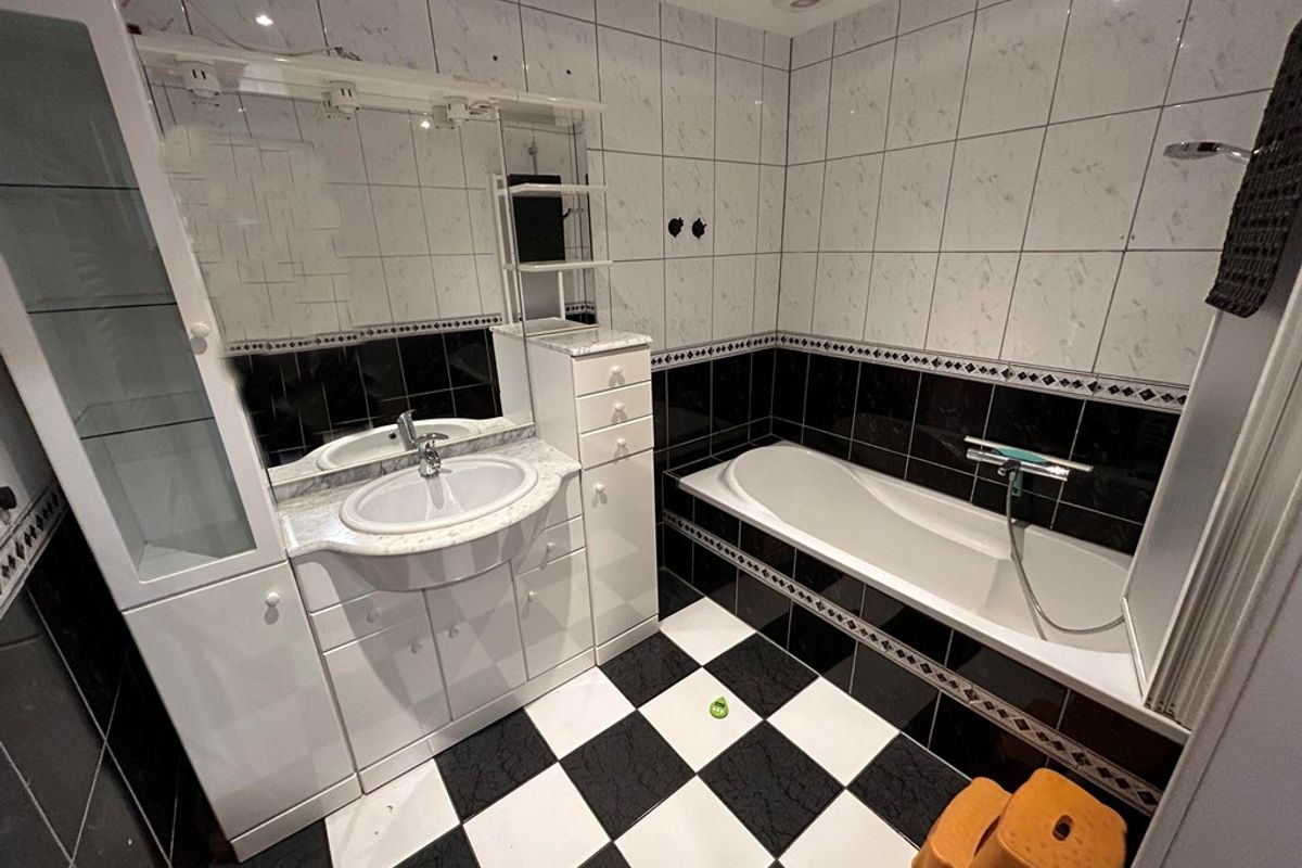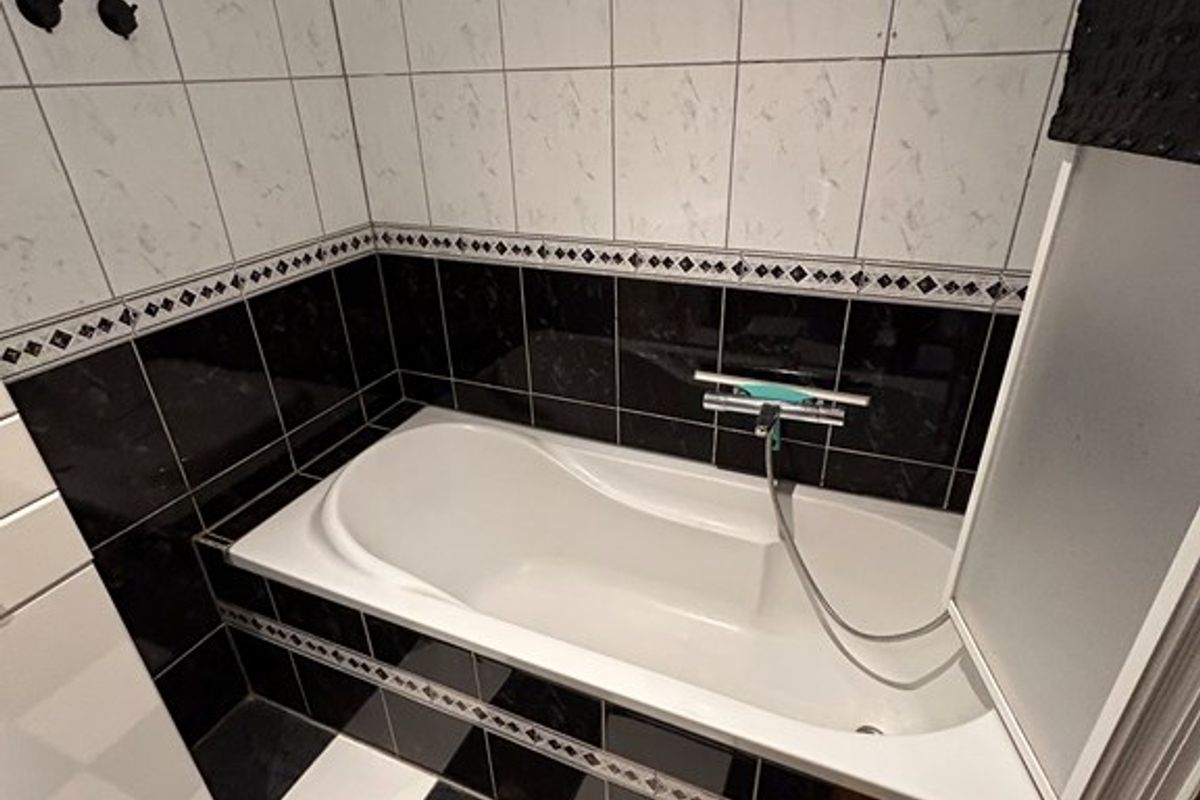 Badkamer 2,55 x 1,80 met plavuizenvloer, inbouwspots, ligbad/douche, badkamermeubel met wastafel en mechanische afzuiging.
