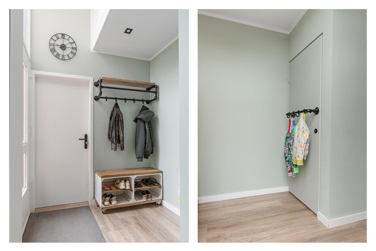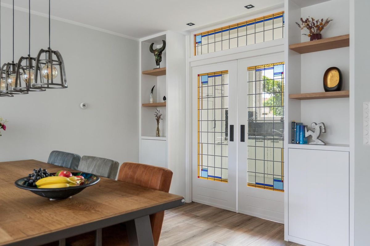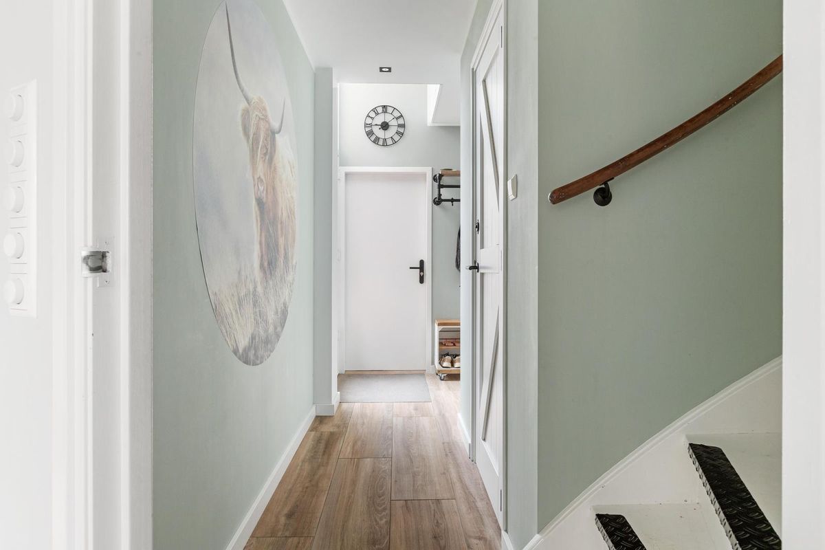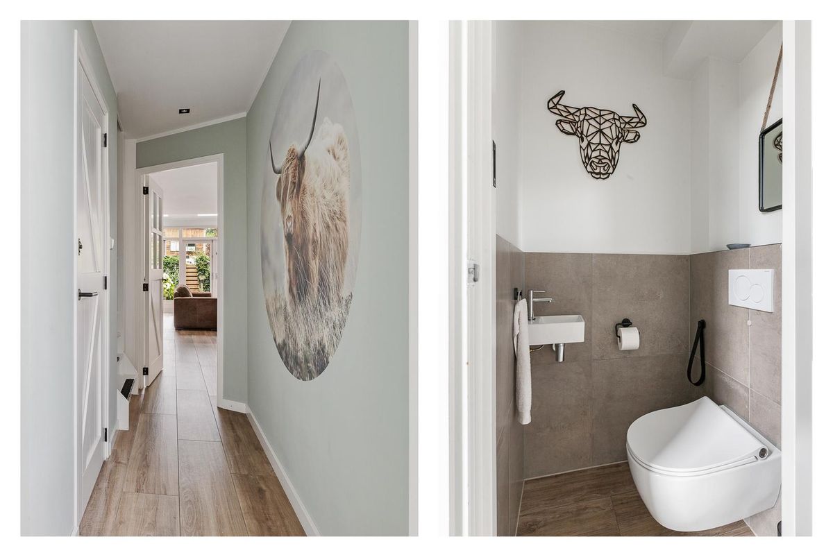 In de hal, naast de fraaie trapopgang, is de stijlvolle toiletruimte met fonteintje. Verder vallen de vernieuwde hardhouten binnendeuren en deurkozijnen op, net als de houtlook keramische tegelvloer met vloerverwarming.