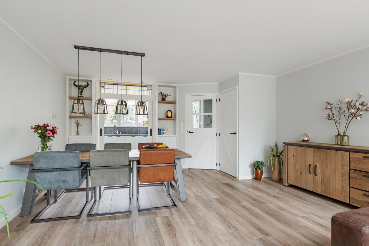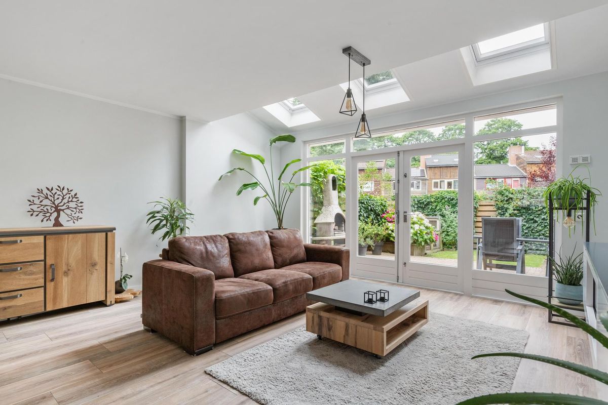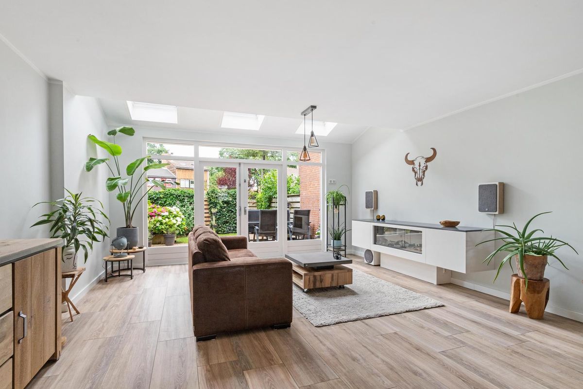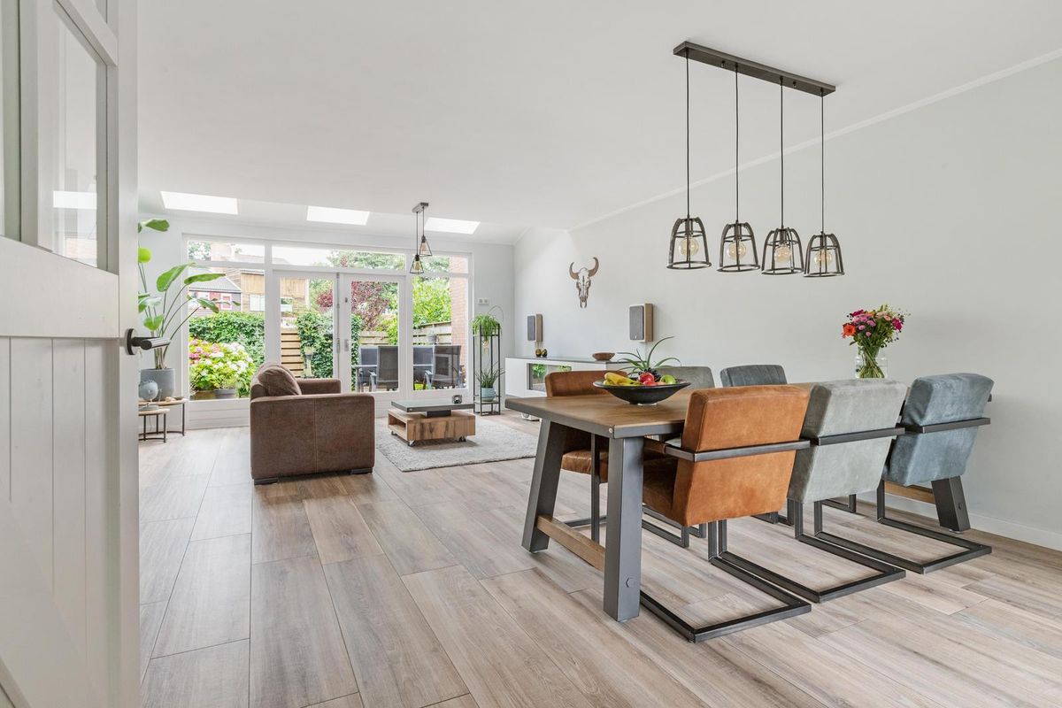 Vanuit de hal heeft u toegang tot de uitgebouwde woonkamer, boordevol sfeer en met mooi uitzicht naar de tuin. Door de elektrisch bedienbare dakramen, met buitenzonwering, en de pui met openslaande tuindeuren valt veel licht naar binnen. Dit is een leefruimte om iedere dag van te genieten, met genoeg plek voor een grote zithoek en een 6-persoons eettafel. Een klein, maar onmisbaar element is de bergkast onder de trap.