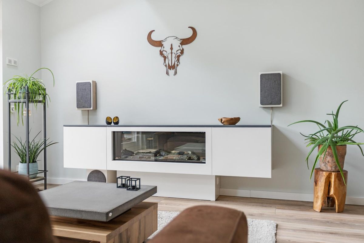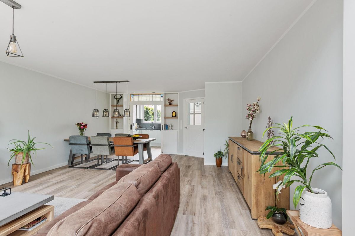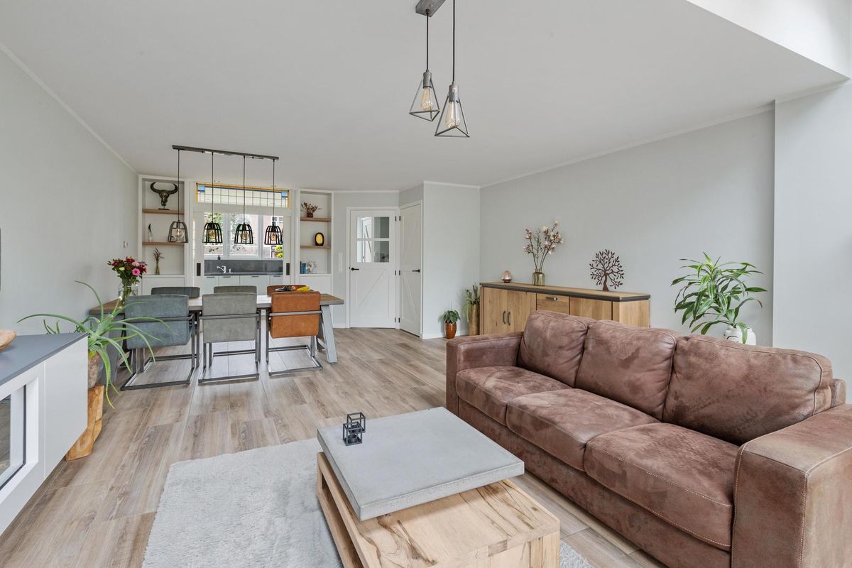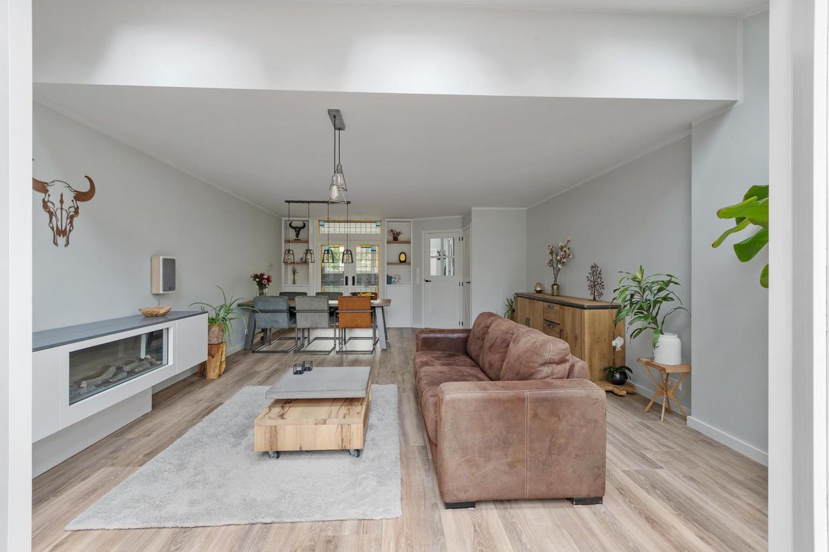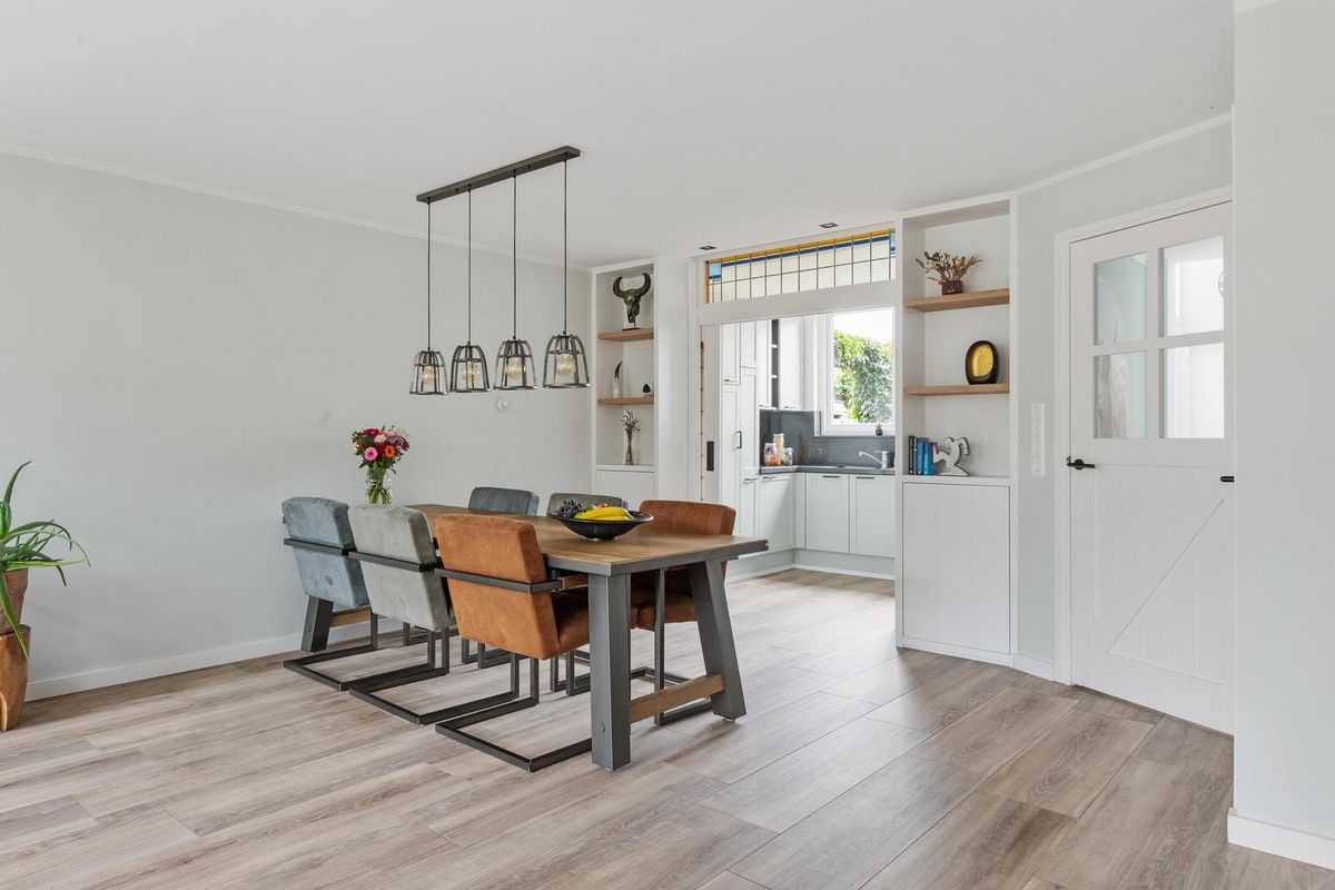 Vanuit de hal heeft u toegang tot de uitgebouwde woonkamer, boordevol sfeer en met mooi uitzicht naar de tuin. Door de elektrisch bedienbare dakramen, met buitenzonwering, en de pui met openslaande tuindeuren valt veel licht naar binnen. Dit is een leefruimte om iedere dag van te genieten, met genoeg plek voor een grote zithoek en een 6-persoons eettafel. Een klein, maar onmisbaar element is de bergkast onder de trap.