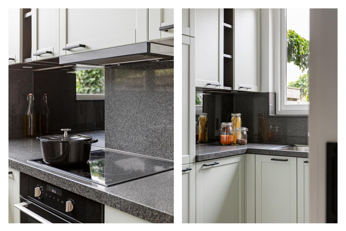 Twee stijlvolle en-suite schuifdeuren, geflankeerd door hoge kasten, geven toegang tot de fraaie keuken. Voor kookliefhebbers en fanatiek hobbykoks is dit een droomkeuken, in een royale U-opstelling met een natuursteen aanrechtblad. De achterwand is van hetzelfde soort natuursteen, wat heel eenvoudig te reinigen is en de keuken een luxe uitstraling geeft. Alle benodigde apparatuur is ingebouwd: een keramische kookplaat, afzuigkap, vaatwasser, oven en een koelkast.