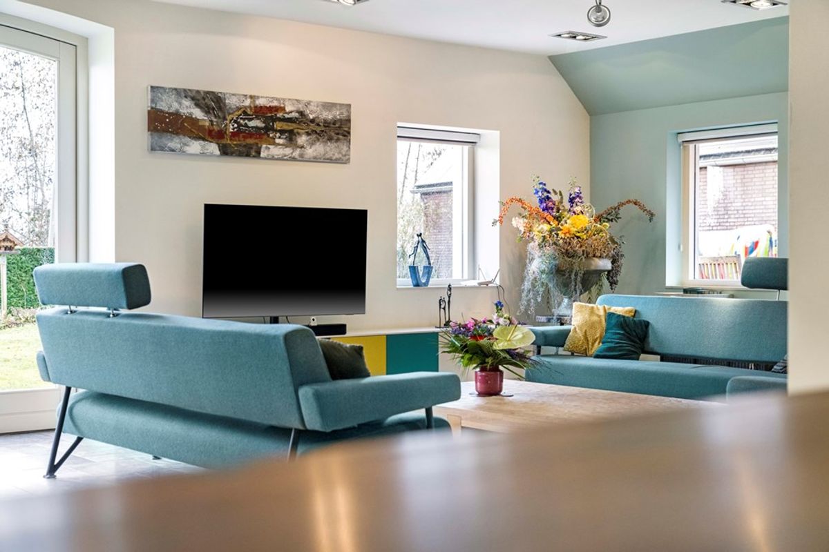 De ruime living met meerdere zithoeken beschikt over grote raampartijen en openslaande deuren naar de tuin, waardoor binnen en buiten naadloos in elkaar overlopen. Vanuit de woonkamer geniet u van een vrij uitzicht over het omliggende groen.