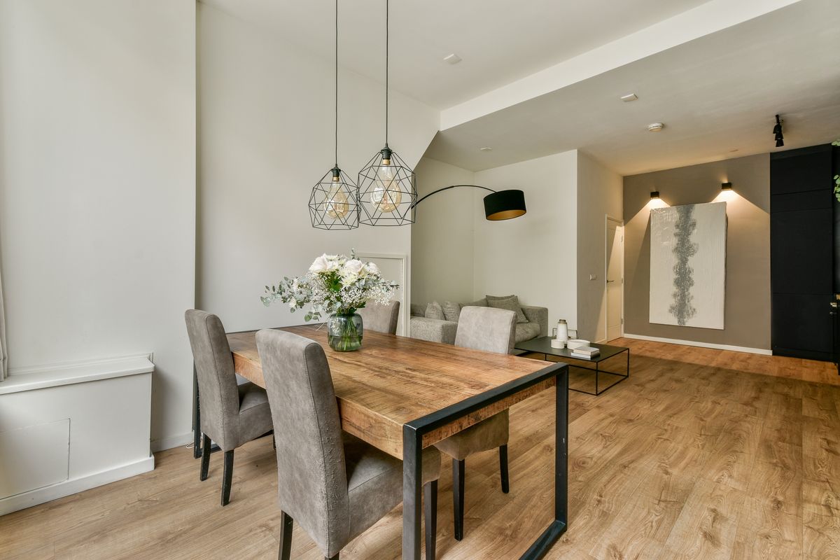 Eigen entree vanaf de straatzijde. De brede en hoge raampartij aan de voorzijde zorgt voor een lichte en aangename sfeer. De ruime woonkamer (circa. 35m2) beschikt over een open keuken. De design keuken is voorzien van alle benodigde inbouwapparatuur en is om maat gemaakt om zo de hoogte te benutten. Je kan perfect tafelen en gasten ontvangen. De ruime woon/-eetkamer biedt plek voor een eettafel met ruimte voor 8 personen. De bank past perfect tussen de opbergruimte onder de trap en de muur.