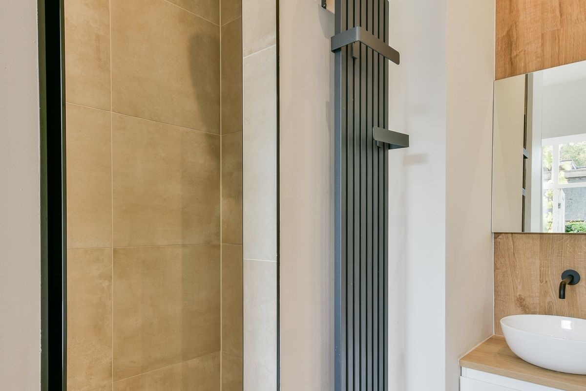 The bedroom with en-suite bathroom is very spacious, light, and connected to the garden. There is almost no better way to wake up. Because it is enclosed and there are no neighbors across the street, there is a lot of privacy and it is very comfortable and pleasant. Truly your own place of tranquility in the middle of Amsterdam. All this is located on the sunny south side. The garden has an outside tap and an electricity connection. The modern bathroom from 2023 is like stepping into a hotel. Luxuriously finished and very spacious. The custom-made cabinets offer more than enough storage space and fit seamlessly into the interior.