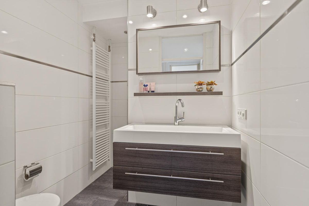 De badkamer is modern en strak afgewerkt. Je vindt hier een inloopdouche, wastafelmeubel, toilet en een designradiator. Hier begin je je dag fris en ontspannen.