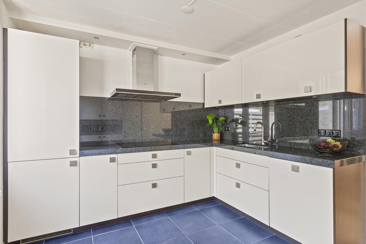 Aan de andere kant bevindt zich de keuken met een praktische indeling. Aan de ene zijde een L-vormige opstelling en aan de andere kant hoge kasten met inbouwapparatuur. De keuken is volledig uitgerust met een inductiekookplaat en afzuigkap, vaatwasser, koel-vriescombinatie, combi-oven en combimagnetron. Hier maak jij de lekkerste gerechten terwijl je gezellig contact houdt met je gasten.