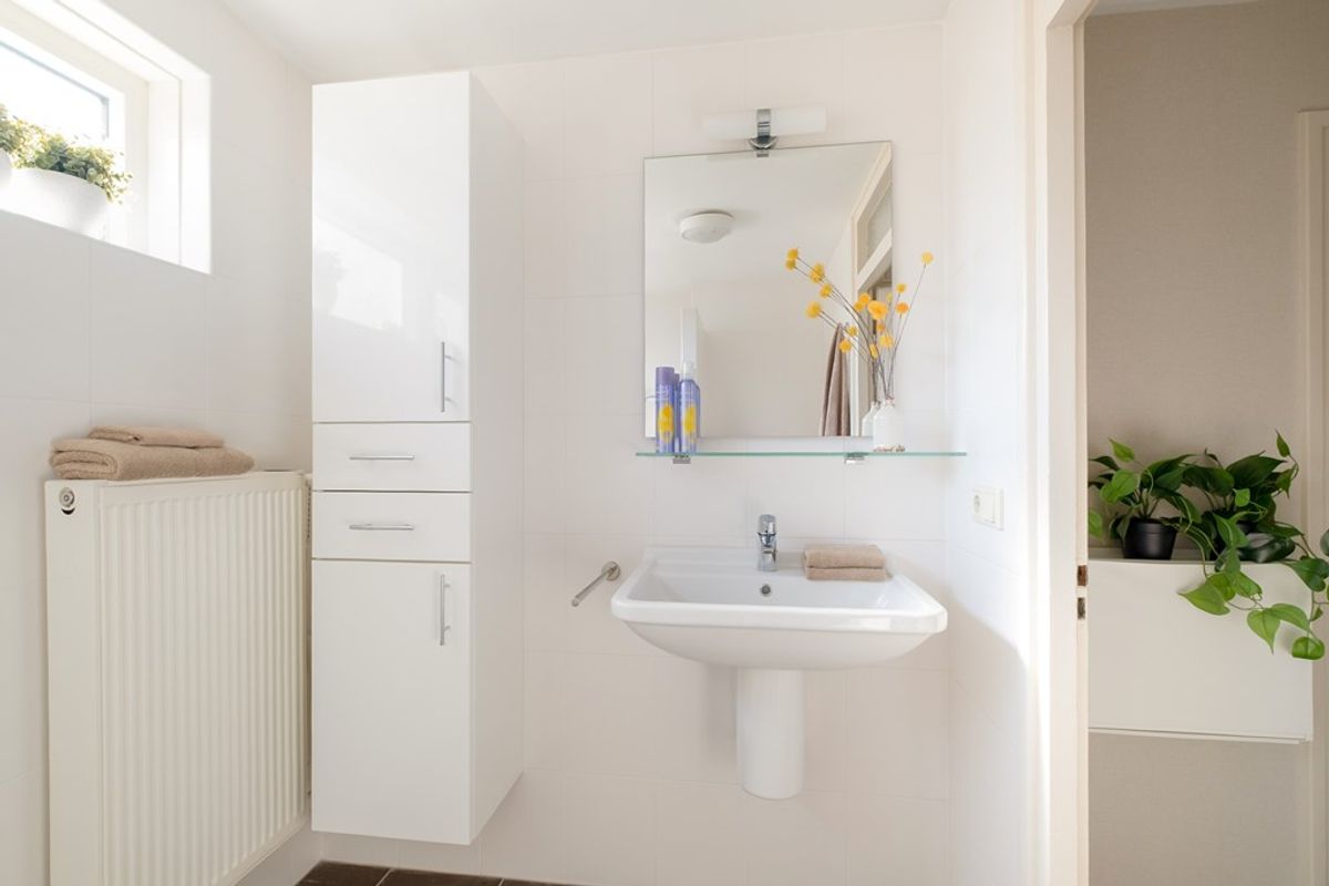 De badkamer is netjes uitgevoerd en voorzien van een inloopdouche, wastafel en toilet. Dankzij de lichte afwerking en het aanwezige daglicht oogt het geheel fris en verzorgd.