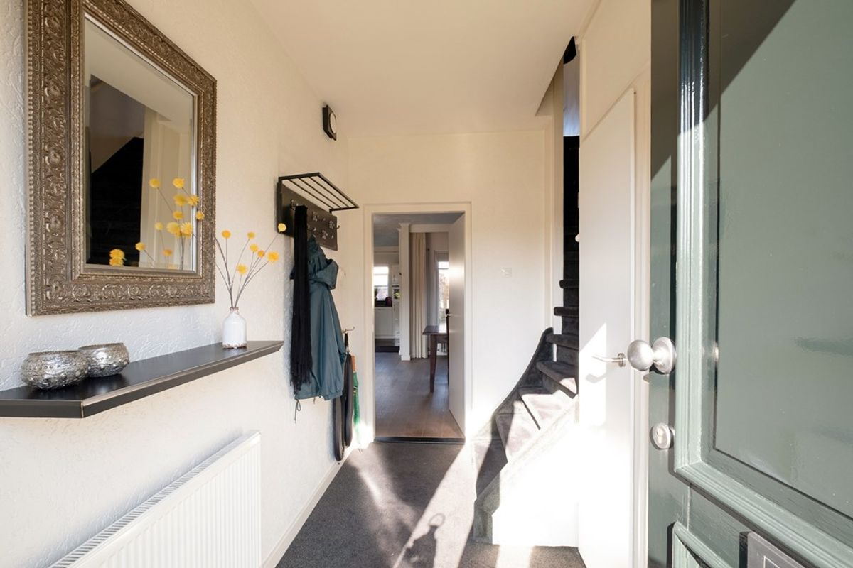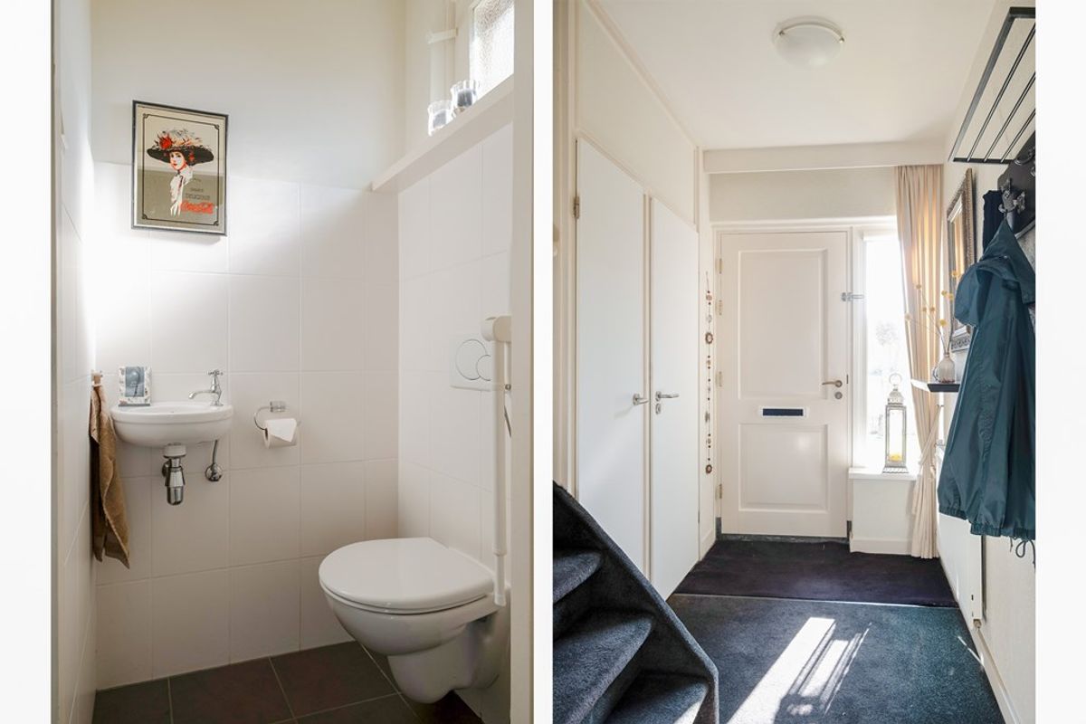 Bij binnenkomst kom je in de entree, voorzien van een modern en fris toilet, de meterkast en de trapopgang naar de verdieping. Het geheel heeft een lichte en verzorgde uitstraling, wat direct een prettige eerste indruk geeft.