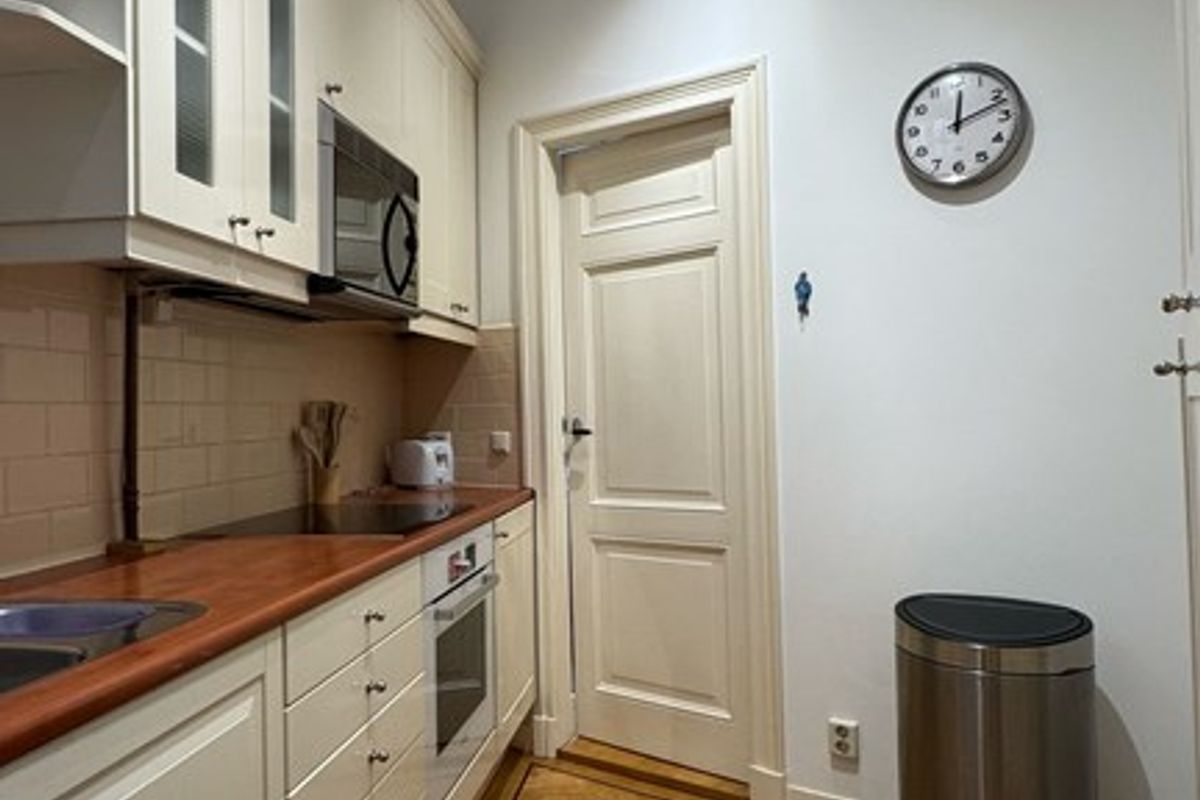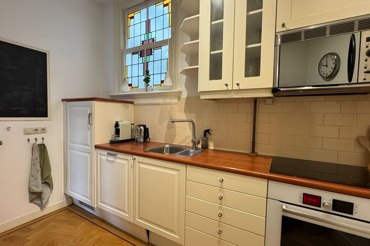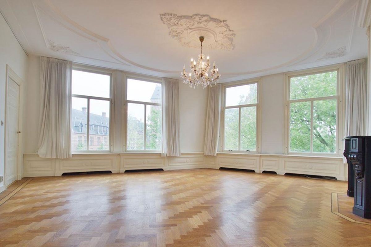Light and bright living room in the front with 5 windows overlooking the "Rijksmuseum" with high ornamented ceiling wooden fishbone parquet floors throughout. Semi-open fully equipped kitchen. Side room with balcony.