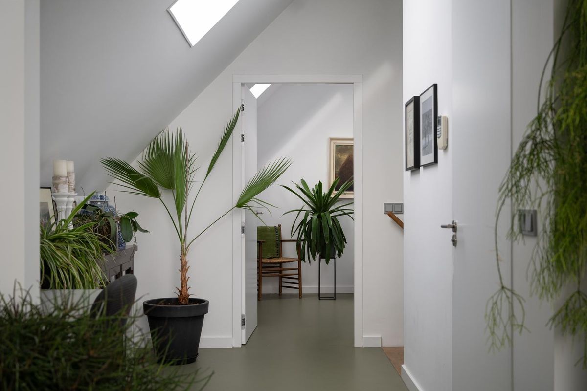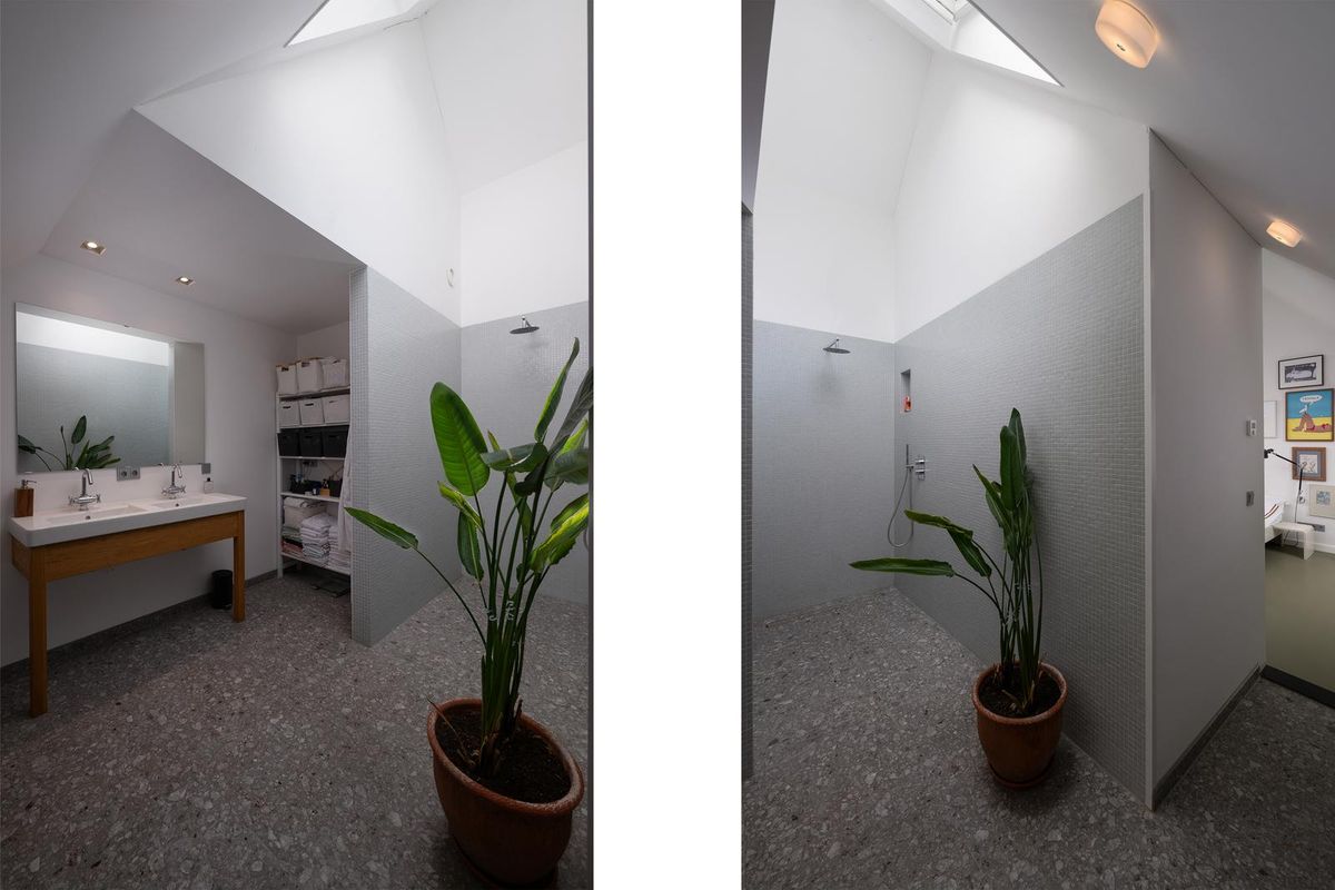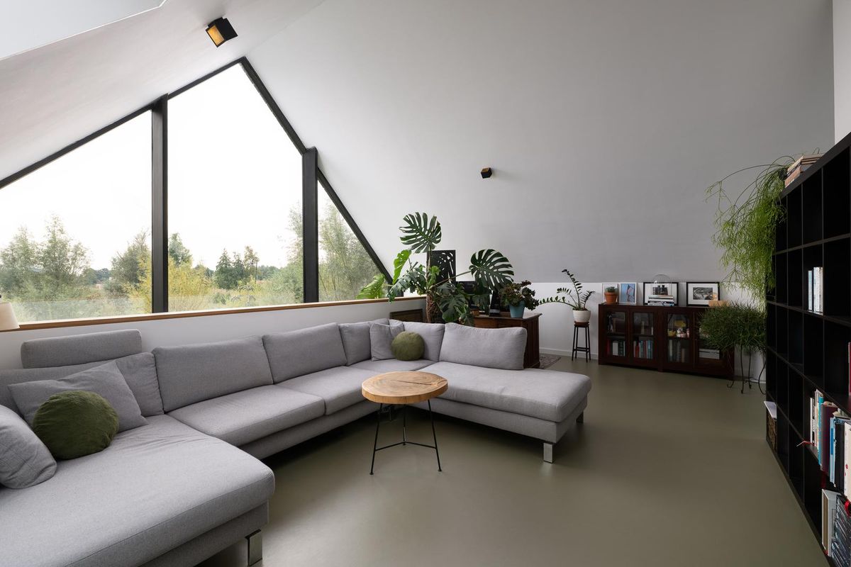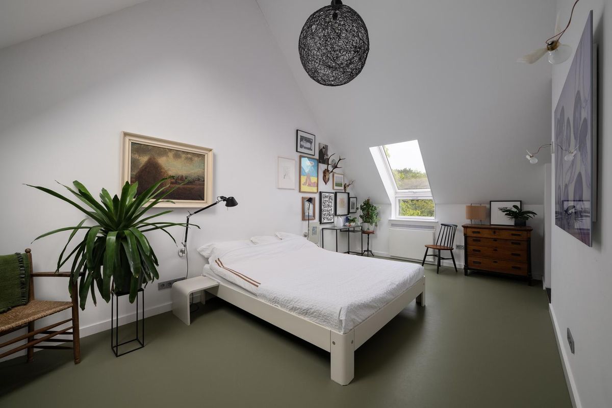 De bovenverdieping biedt een geheel eigen sfeer: rustig, licht en besloten. Hier vind je een royale slaapkamer met ensuite badkamer én een apart woongedeelte. Deze verdieping voelt als een privéverblijf – een plek waar je kunt terugtrekken, lezen, werken of simpelweg genieten van de stilte. De schuine lijnen van het dak, de vide, dakramen en de doorkijk naar beneden zorgen voor een unieke ruimtelijke beleving.