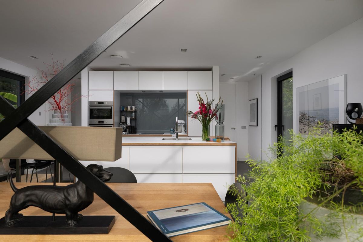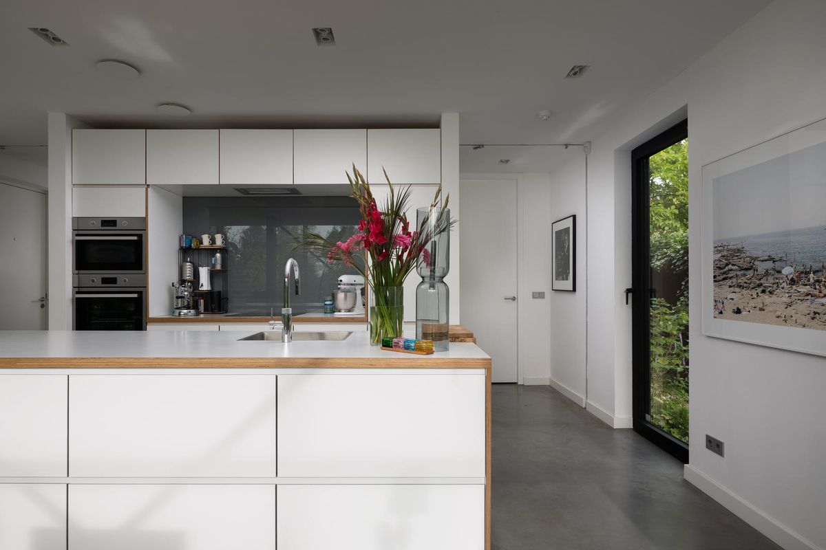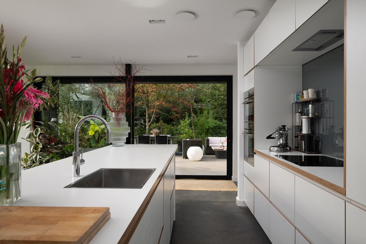 De moderne keuken vormt het hart van het huis – een plek waar koken, praten en genieten vanzelf samengaan. Vanuit de keuken stap je zo de tuin in, waar het groen je omarmt.