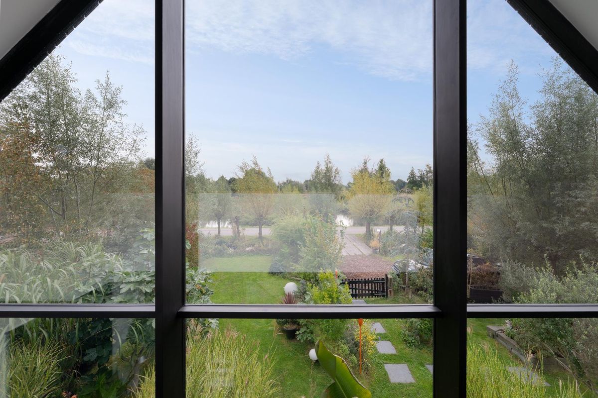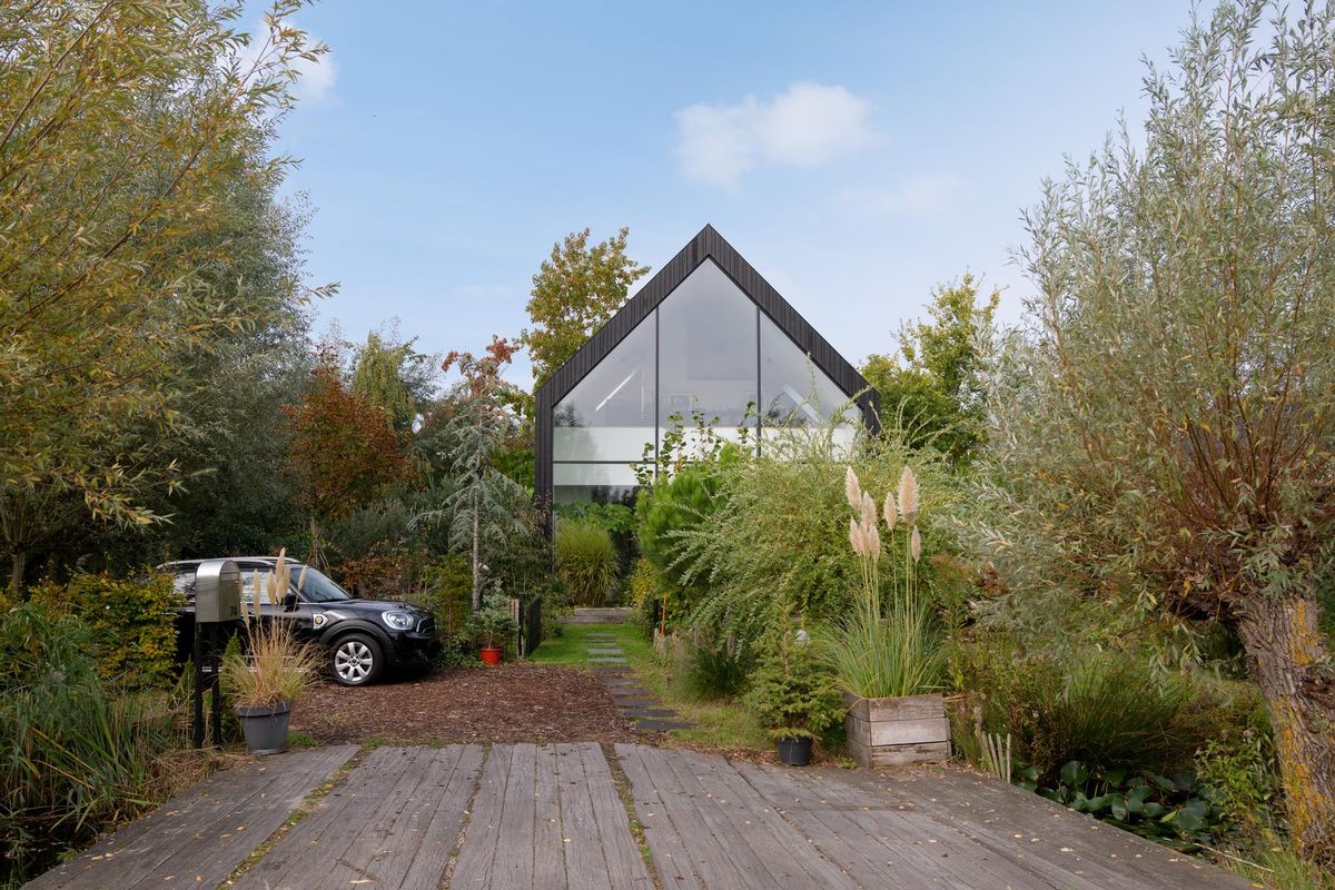 You arrive via your own wooden bridge, the driveway framed by reeds and lush greenery. Private parking is available on your own property. The deep black façade, accented with glass, instantly hints at what lies within. Step inside, and calm takes over – openness, light, and a natural flow.