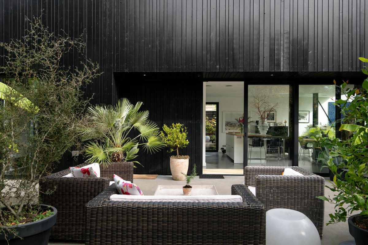 Je arriveert via je eigen houten brug, de oprit omlijst door riet en groen. Parkeren doe je op eigen terrein. De gevel, diepzwart met grote glazen vlakken, verraadt direct het bijzondere binnenleven. Zodra je binnenstapt, voel je de rust: openheid, licht en een natuurlijke flow.