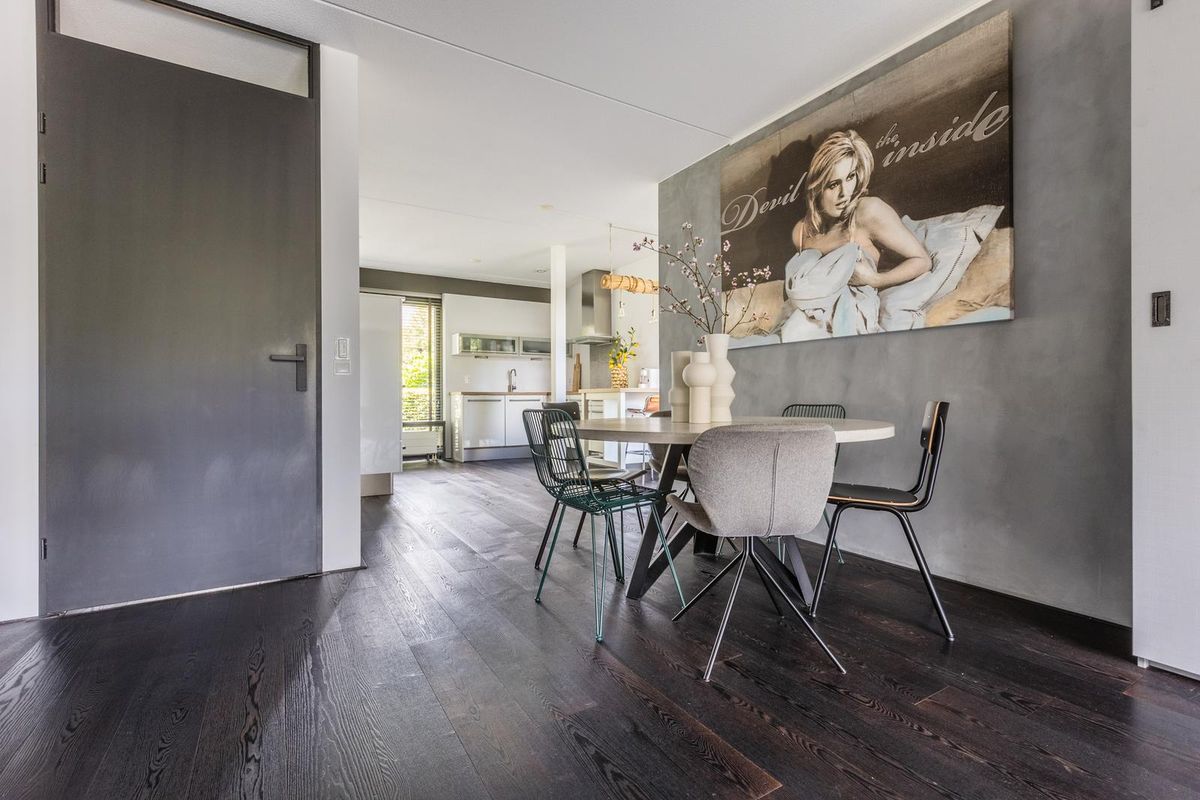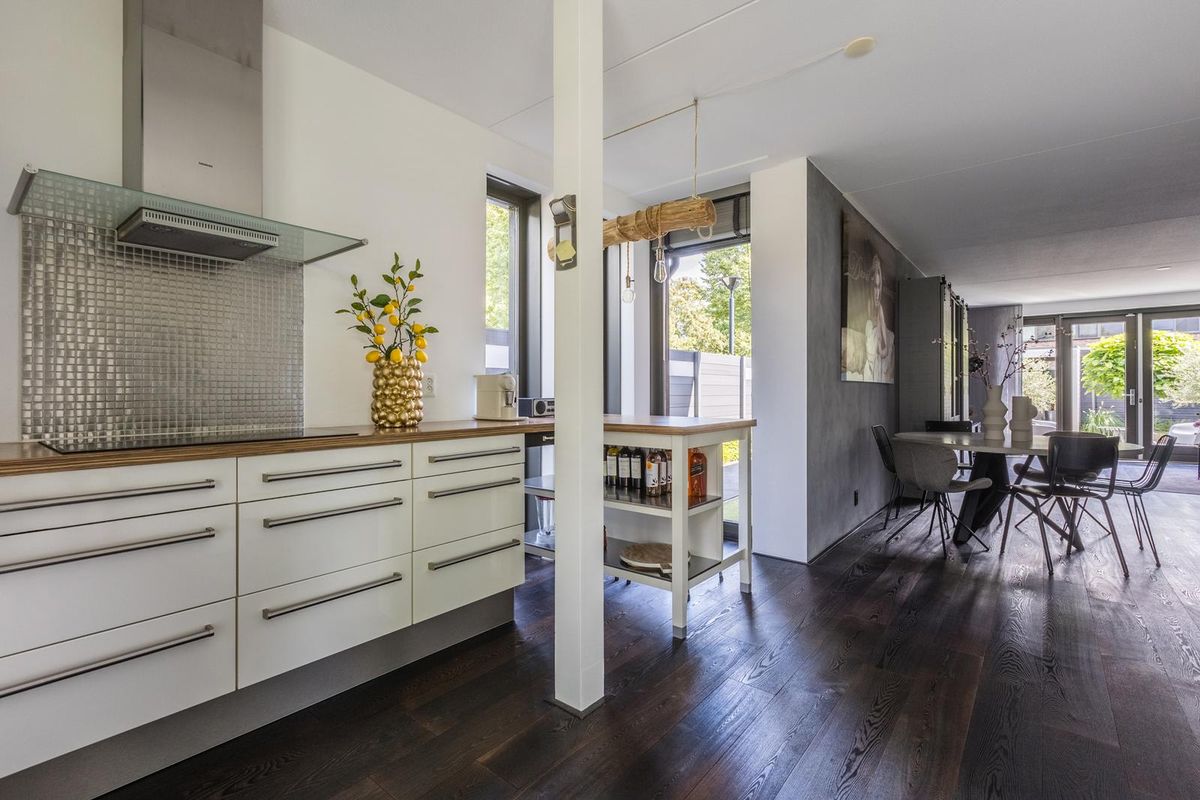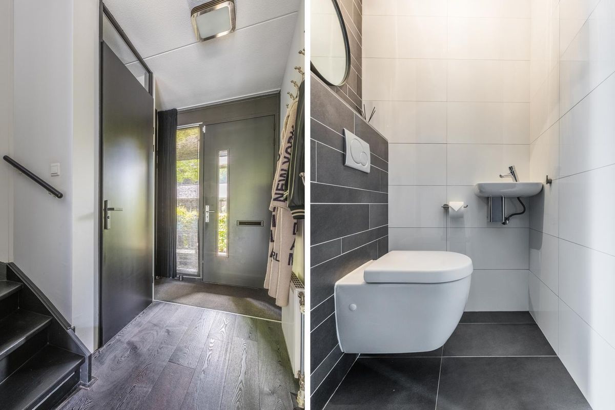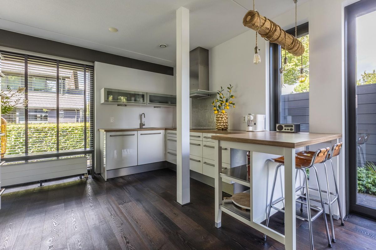 Begane grond: verzorgde, onderhoudsvriendelijke voortuin met afsluitbare poort naar de zij- en achtertuin. Overdekte entree naar de hal met garderobe, modern uitgevoerde toiletruimte (v.v. wandcloset en hoekfontein), meterkast (met glasvezelaansluiting) en trapopgang. De lamelparketvloer loopt door vanuit de hal naar de woonkamer met uitbouw (3 meter). De living heeft een aangename wegkijk middels de brede raampartij met openslaande deuren naar de achtertuin. In de praktische kast onder de trap is veel bergruimte beschikbaar. Met zicht op het groene hof – met gezellige plek om met buurtgenoten samen te komen – aan de voorzijde en de tuin opzij is de lichte open keuken met barelement in U-vorm opgesteld. Het kookgedeelte is ingericht met een inductie kookplaat (4 warmtezones), afzuigkap, vaatwasser, spoelbak (met snel warm water dankzij de close-in boiler) en voldoende laden en kasten. In een wandopstelling zijn de grote koelkast, combi-oven en nog meer bergruimte verwerkt.