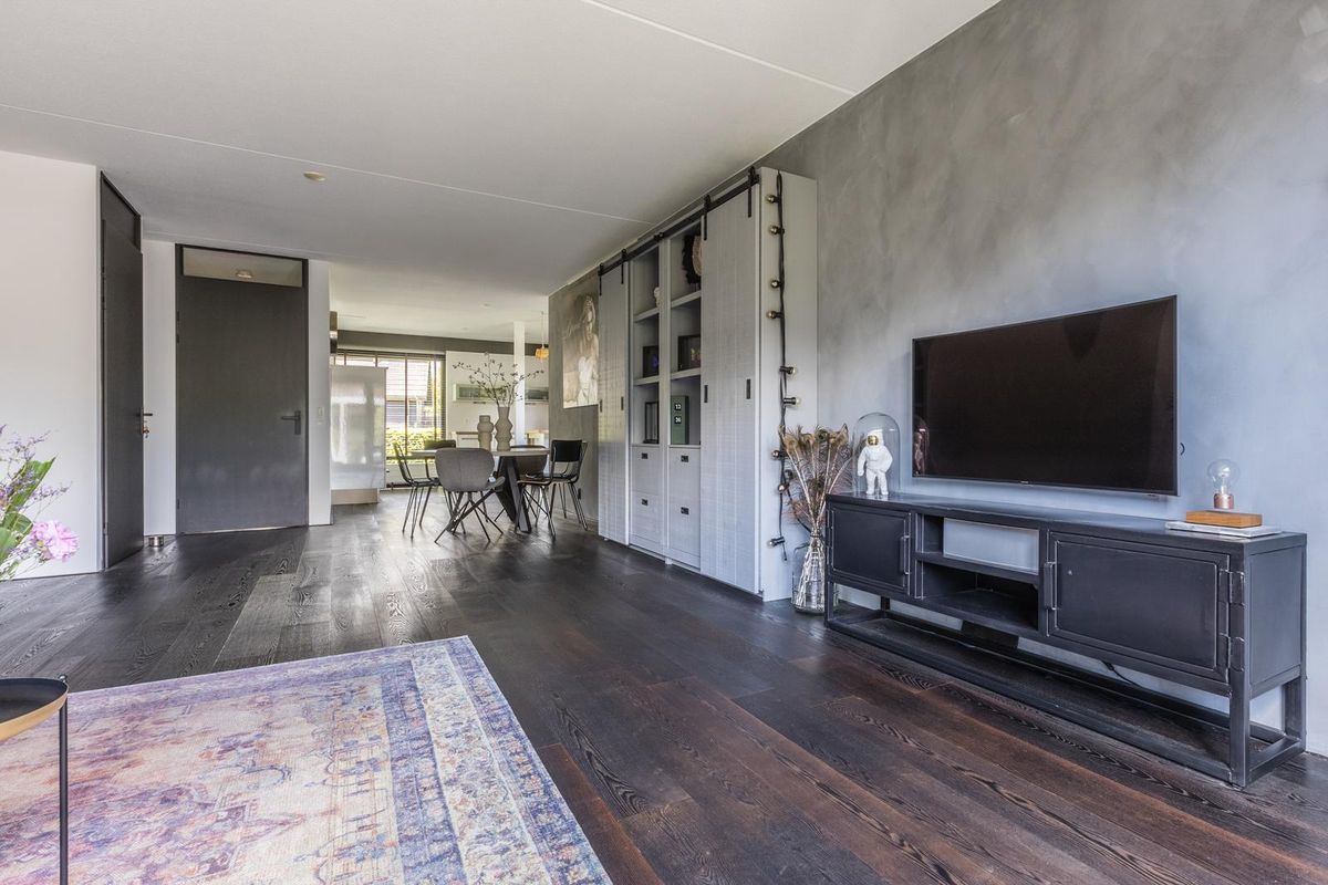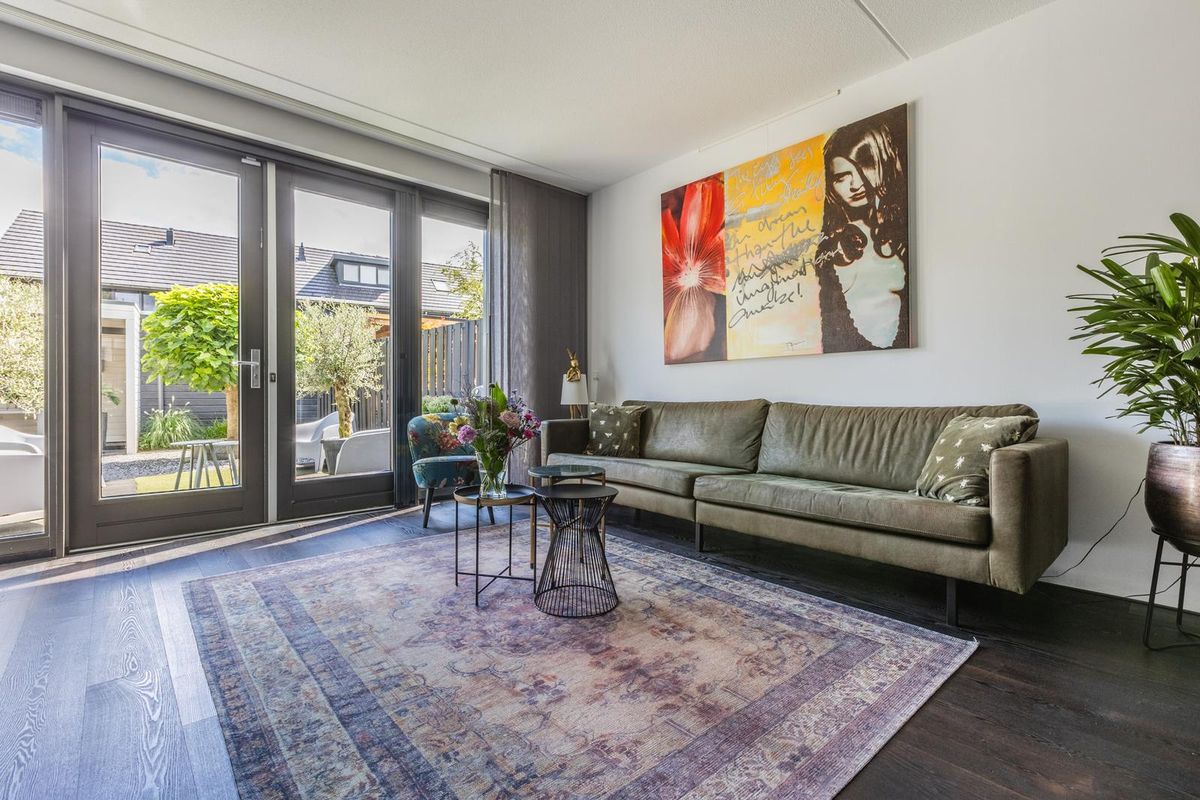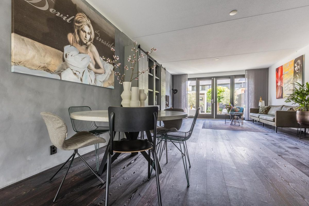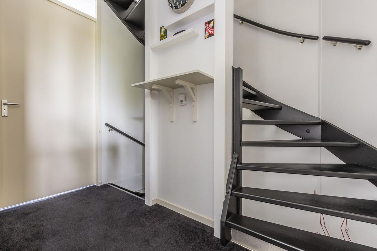Begane grond: verzorgde, onderhoudsvriendelijke voortuin met afsluitbare poort naar de zij- en achtertuin. Overdekte entree naar de hal met garderobe, modern uitgevoerde toiletruimte (v.v. wandcloset en hoekfontein), meterkast (met glasvezelaansluiting) en trapopgang. De lamelparketvloer loopt door vanuit de hal naar de woonkamer met uitbouw (3 meter). De living heeft een aangename wegkijk middels de brede raampartij met openslaande deuren naar de achtertuin. In de praktische kast onder de trap is veel bergruimte beschikbaar. Met zicht op het groene hof – met gezellige plek om met buurtgenoten samen te komen – aan de voorzijde en de tuin opzij is de lichte open keuken met barelement in U-vorm opgesteld. Het kookgedeelte is ingericht met een inductie kookplaat (4 warmtezones), afzuigkap, vaatwasser, spoelbak (met snel warm water dankzij de close-in boiler) en voldoende laden en kasten. In een wandopstelling zijn de grote koelkast, combi-oven en nog meer bergruimte verwerkt.