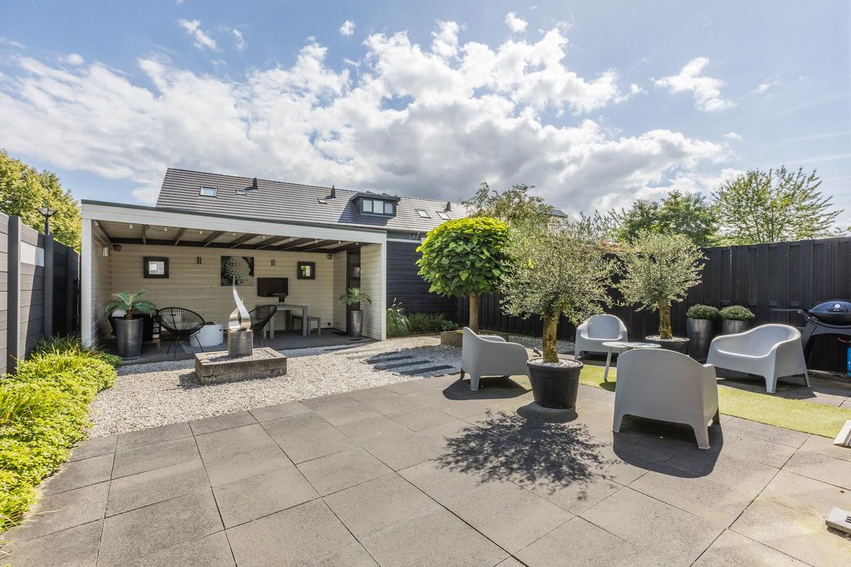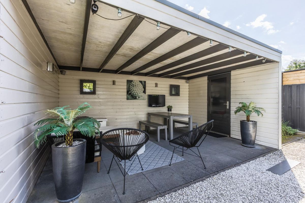 De sfeervolle zij- en achtertuin is omheind met een in antraciet uitgevoerd composiet-houten schutting (aan de buitenzijde begroeid met klimplanten). De inrichting bestaat uit een heerlijk terras, grindbedden, een plantenvak met bolcatalpa, langgerekte border met fraai afwisselende beplanting en een vrijstaande houten berging met heerlijke overkapping. De overkapping is voorzien van elektriciteit, verlichting, speakers en een aansluiting voor een televisie. Deze besloten tuin biedt een aangenaam gevoel van rust & privacy.
