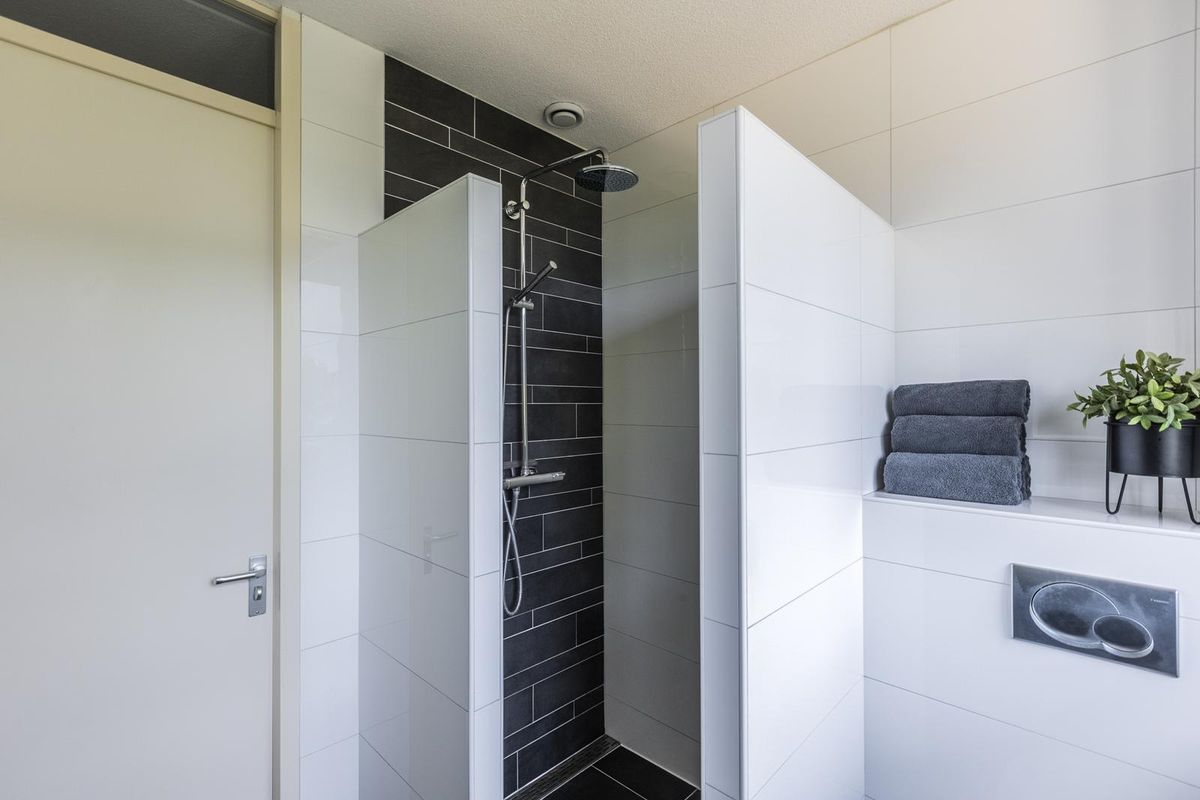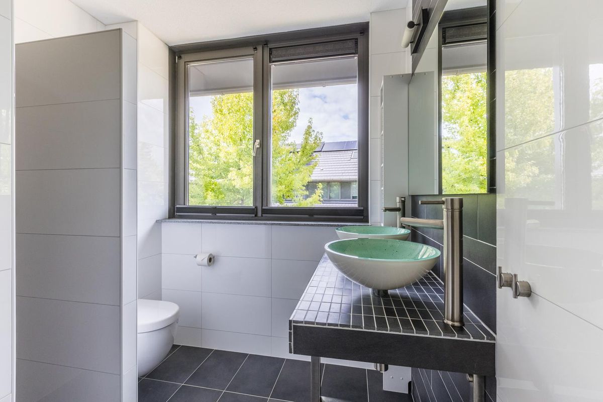 Eerste verdieping: overloop met deuren naar de twee slaapkamers en de badkamer en vaste (open) trap naar de zolderetage. De master bedroom beslaat de volle breedte van de woning aan de achterzijde en heeft een vaste garderobekast (met ruimtebesparende schuifdeuren) en een grote raampartij uitkijkende over de achtertuin (met klein deel van het raam ook opzij). Aan de voorzijde van de woning grenst aan de tweede slaapkamer de badkamer. Deze sanitaire ruimte is ingericht met een inloopdouche (met hand- en regendouche en draingoot), strak en breed wastafelblad met twee waskommen, een grote spiegel met spiegelverwarming en verlichting erboven en een wandcloset. Op de overloop en slaapkamers is gekozen voor een zachte vloerbedekking.
