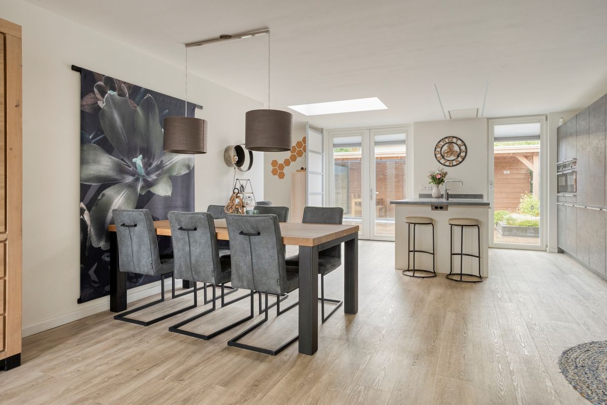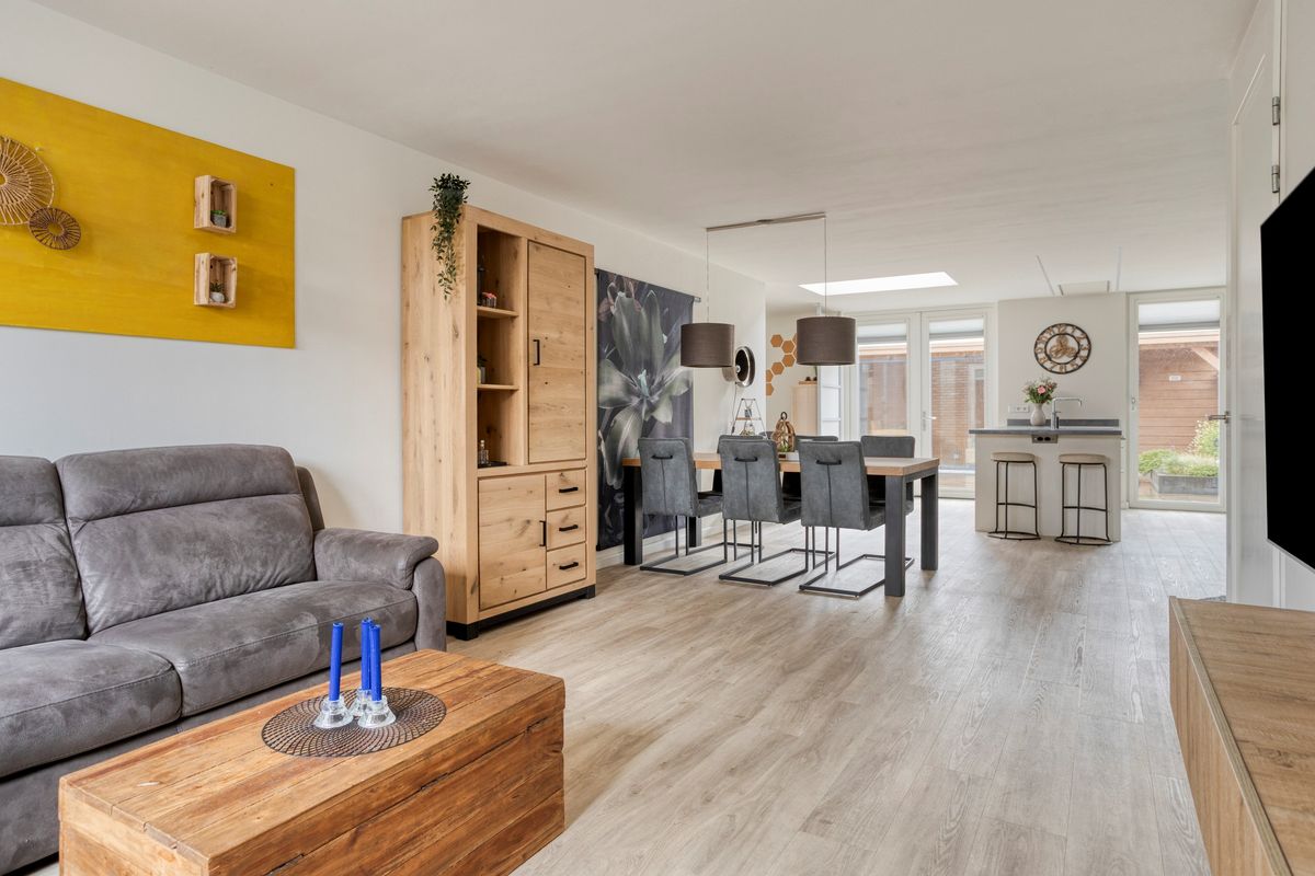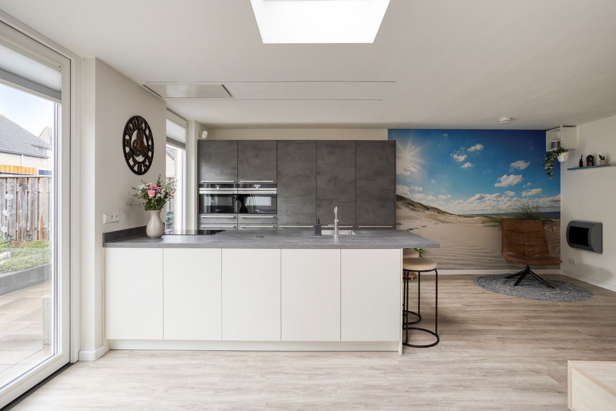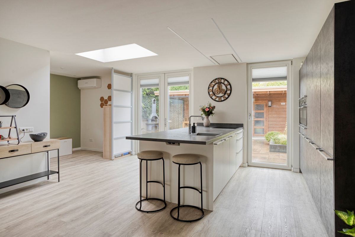 De ruime en lichte woonkamer met open keuken is v.v. tuindeuren welke toegang geven tot de achtertuin. Vanuit de woonkamer is de trapopgang naar de eerste verdieping bereikbaar. Deze trapopgang is v.v. een praktische trapkast wat voor extra bergruimte zorgt. Ook is er vanuit de woonkamer een ruimte bereikbaar welke te gebruiken is als speel-of werkkamer. Vanuit deze ruimte is er een directe toegang tot de aangebouwde berging. De keuken met wandopstelling en een kookeiland is v.v. diverse kasten en lades, een kunststof werkblad met spoelbak en kokend waterkraan (Quooker), afzuigkap (Novy), 2 x een combi-oven, koelkast en vaatwasser (allen Siemens). Het toilet is deels betegeld en v.v. een hangend toilet en fonteintje. De vloer van de begane grond is v.v. pvc en vloerverwarming. De wanden en plafonds zijn afgewerkt met stucwerk. De kozijnen zijn van kunststof met HR++ glas. Op de begane grond is airconditioning (Mitsubishi) aanwezig.