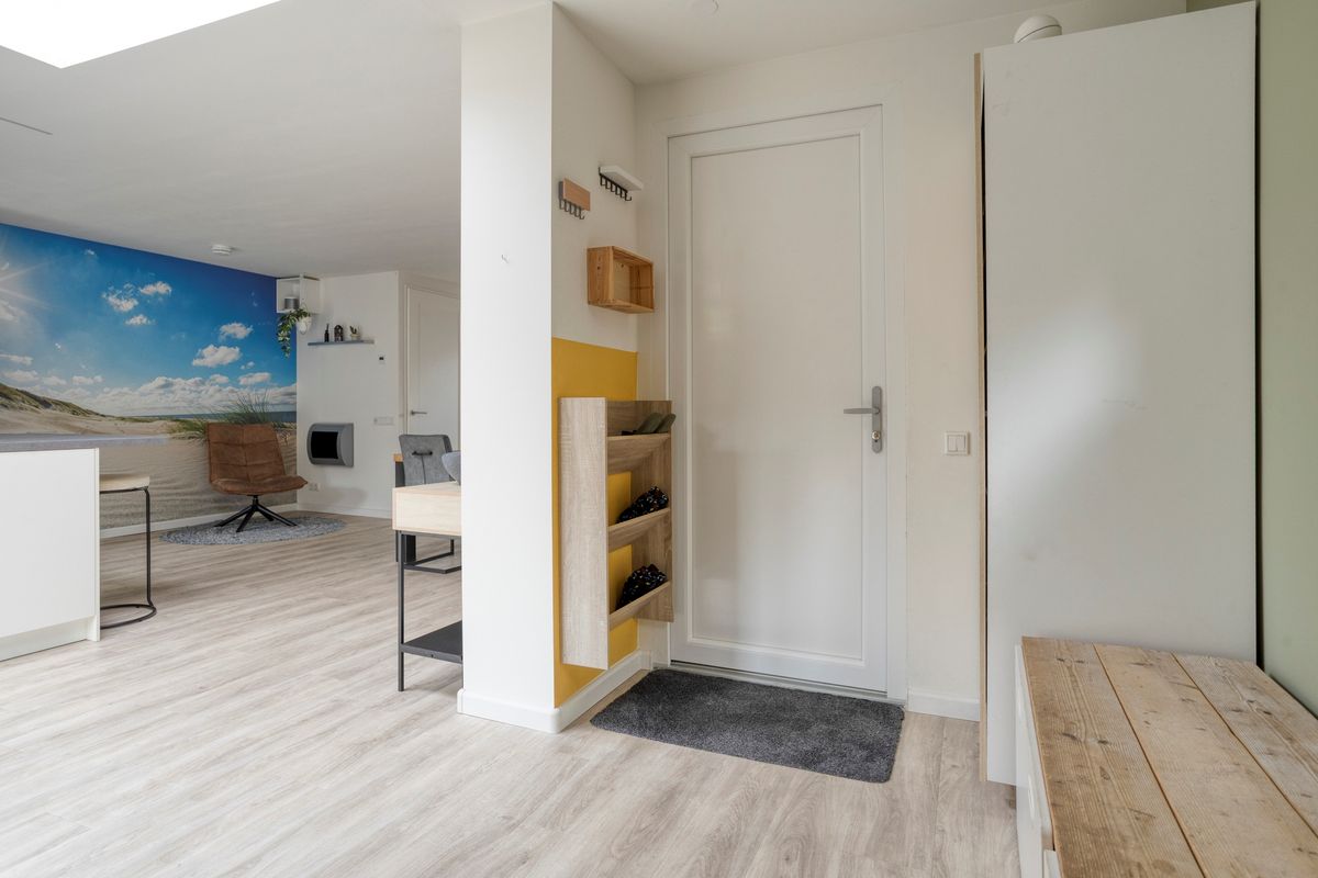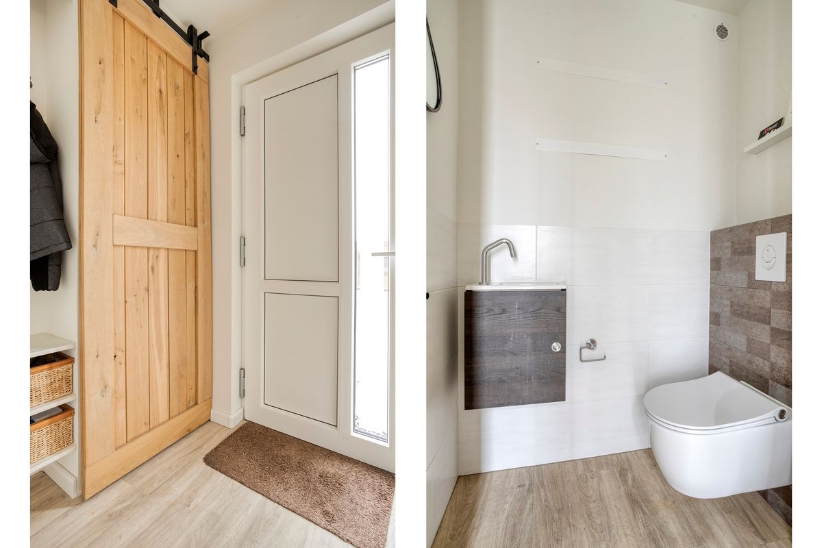 Vanuit de hal/entree, met meterkast en garderobe nis, is er toegang tot de woonkamer en het toilet.