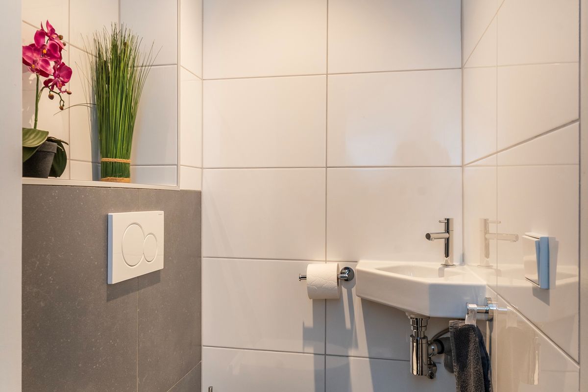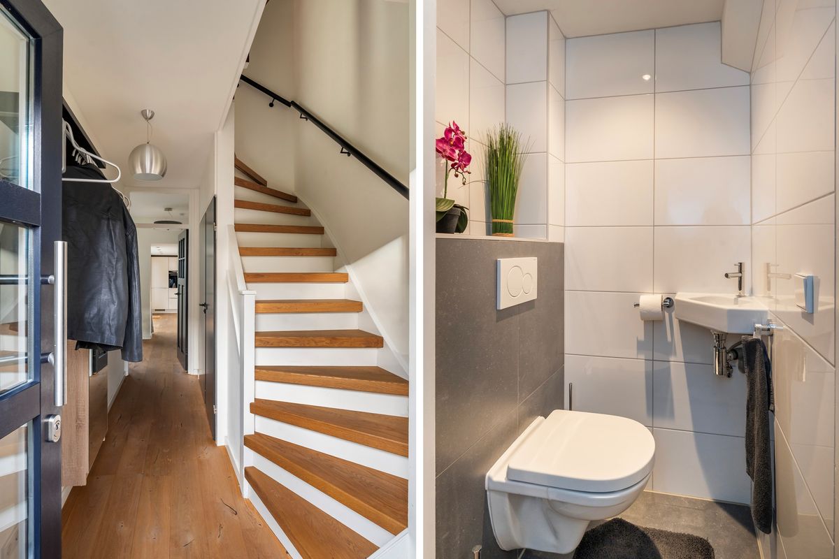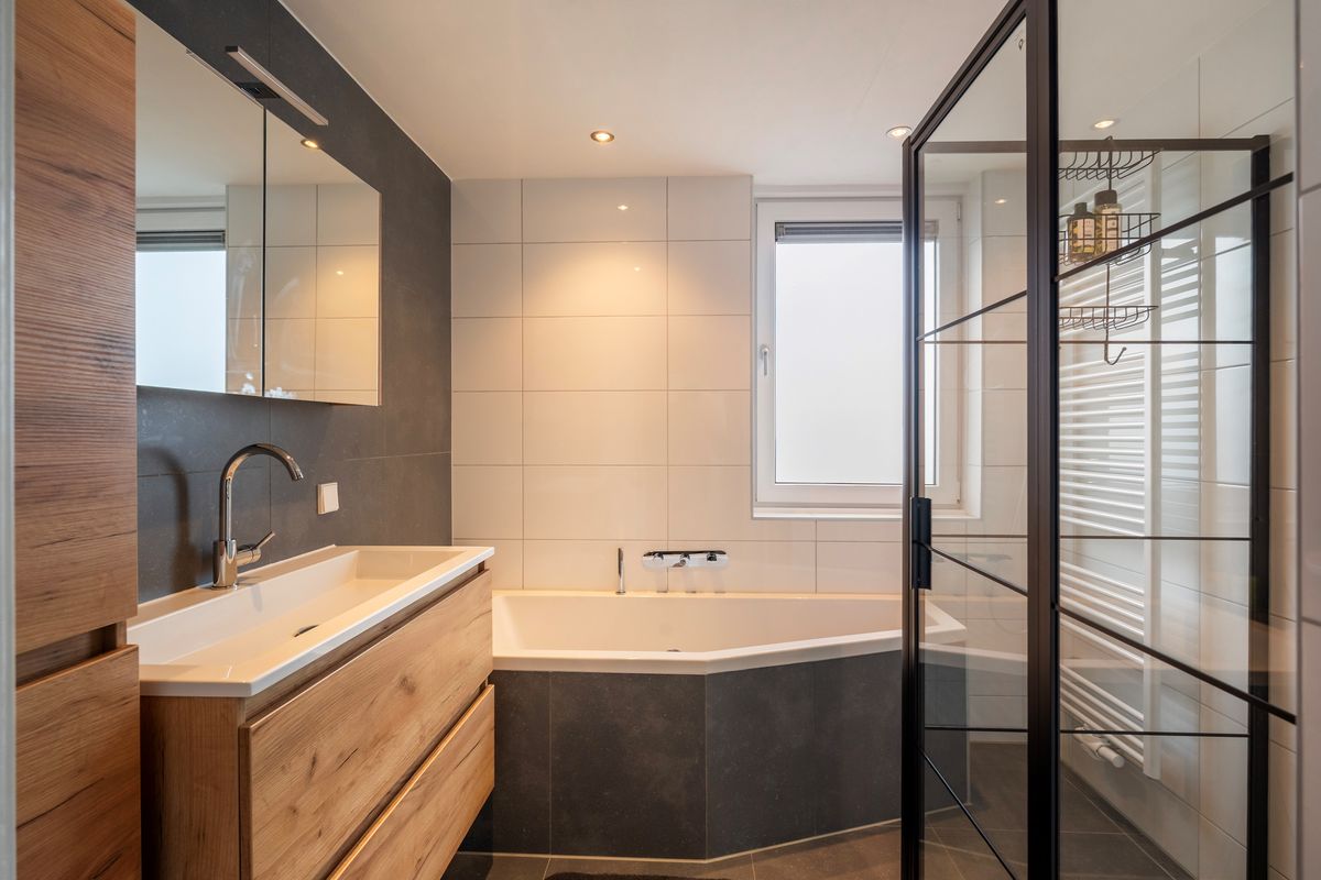 Overloop met toegang tot twee ruime slaapkamers (voor en achter), een stijlvolle badkamer, een separaat toilet met fonteintje én een aparte wasruimte – ideaal voor wasmachine, droger en extra opslag. De badkamer is recent vernieuwd en een waar plaatje: modern betegeld, met inloopdouche, ligbad en een fraai wastafelmeubel.