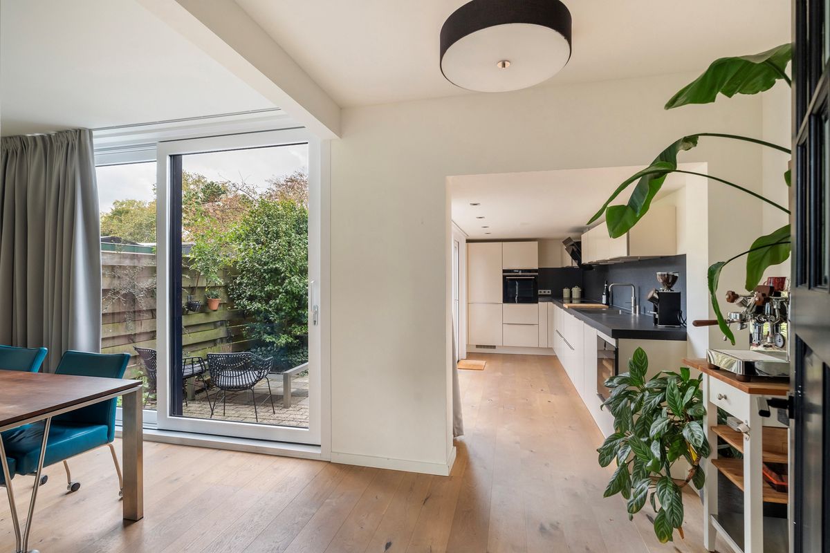 Aan de achterzijde is de woning uitgebouwd en voorzien van een moderne open keuken met veel licht inval door mooie, grote kunststof raamkozijnen. De keuken is compleet uitgerust met o.a. een inductie kookplaat, vaatwasser, afzuigkap, combi-oven, een Quooker COMBI+ en een luxe Liebherr wijnklimaatkast. Een plek waar koken en gezelligheid perfect samenkomen.