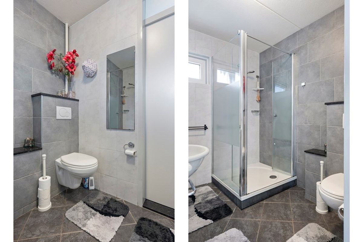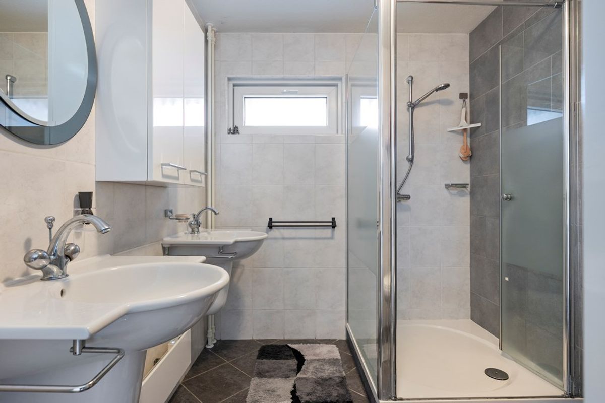 De moderne badkamer is voorzien van een douchecabine , twee wastafels met opbergmeubel en een toilet. Op 2 slaapkamers en de badkamer bevinden zich elektrische panelen.