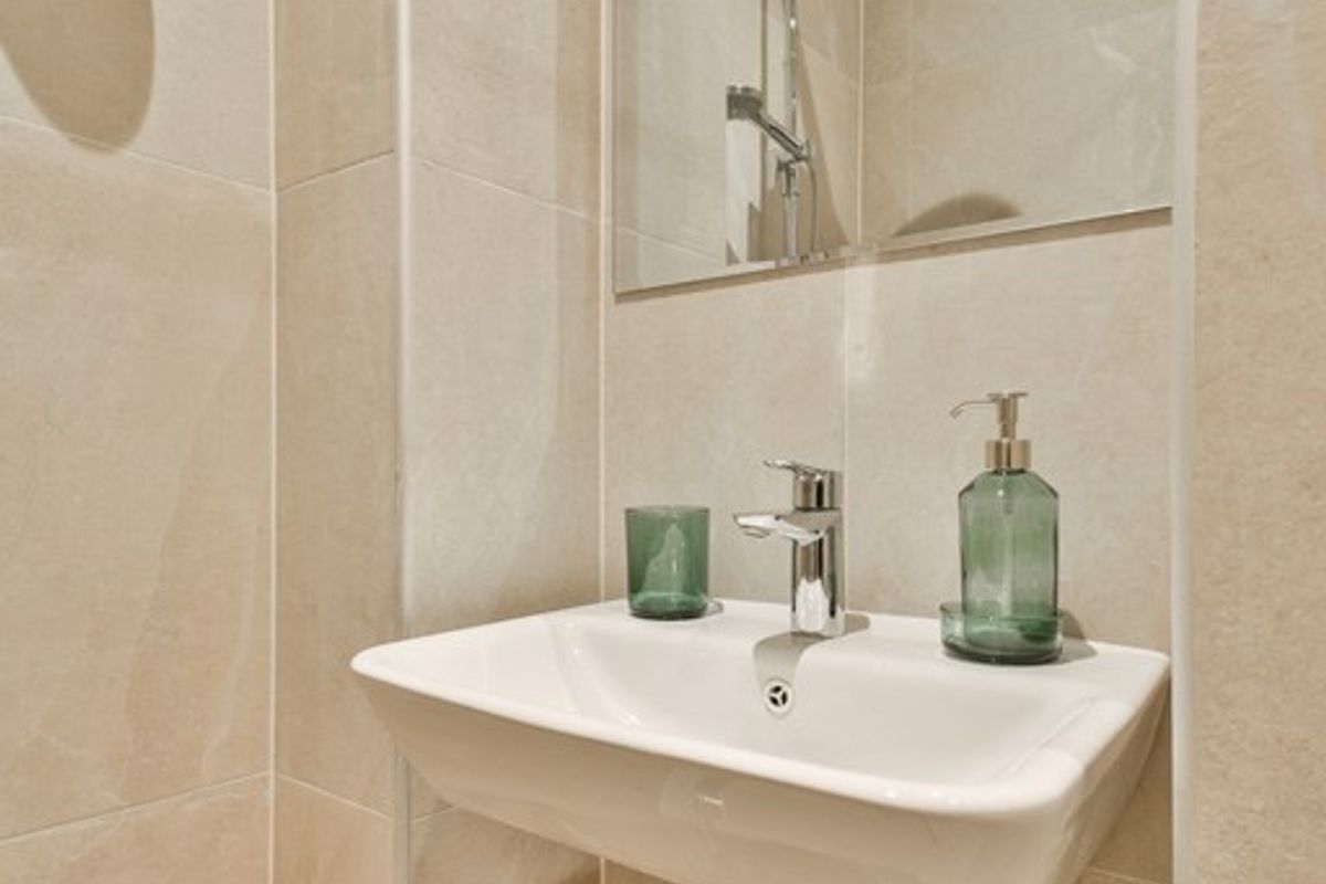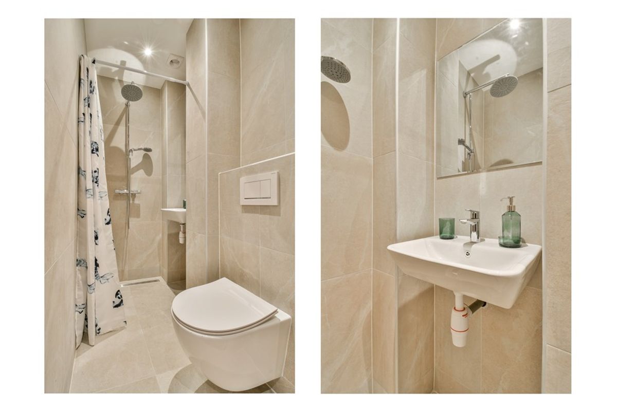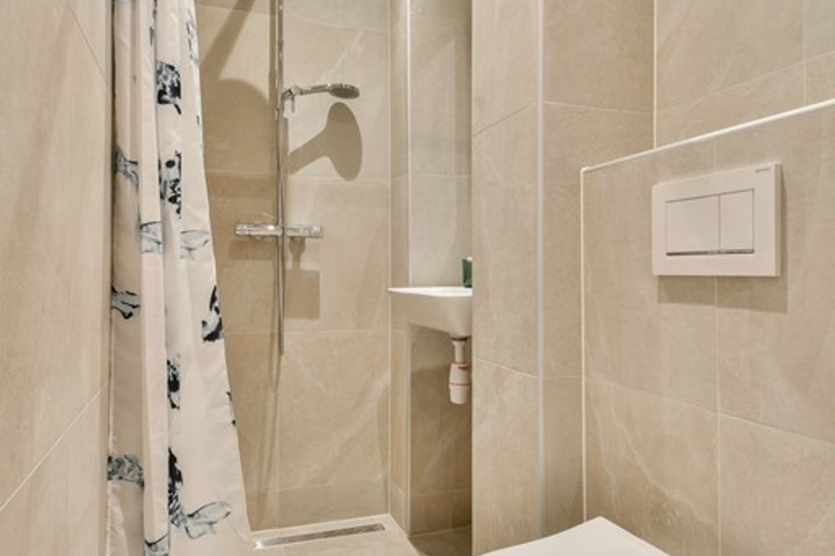 De nieuwe, luxe badkamer beschikt over een inloopdouche, wastafel met spiegel en een toilet. Tevens is er vloerverwarming aanwezig.