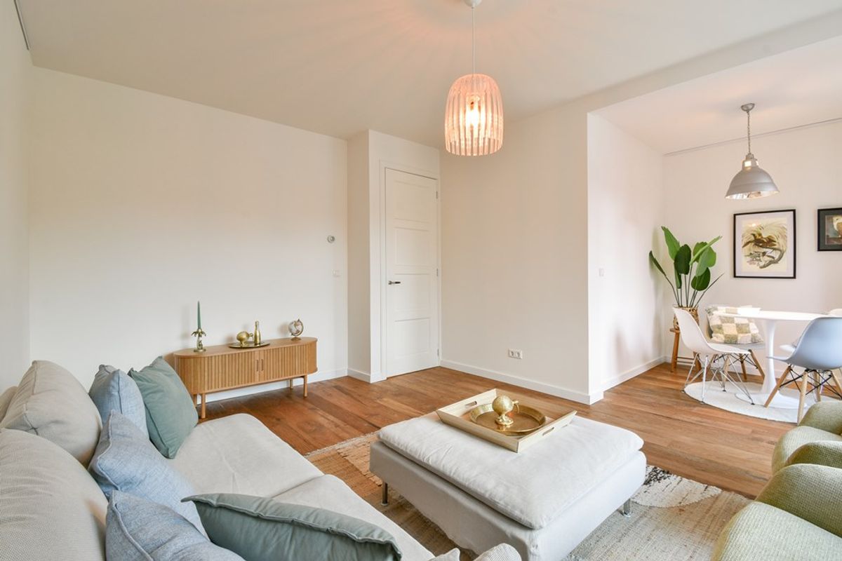 De zonnige, lichte woonkamer met zijkamer en een erker heeft een mooie houten vloer. Vanuit de woonkamer is er vrij uitzicht over een plein.
