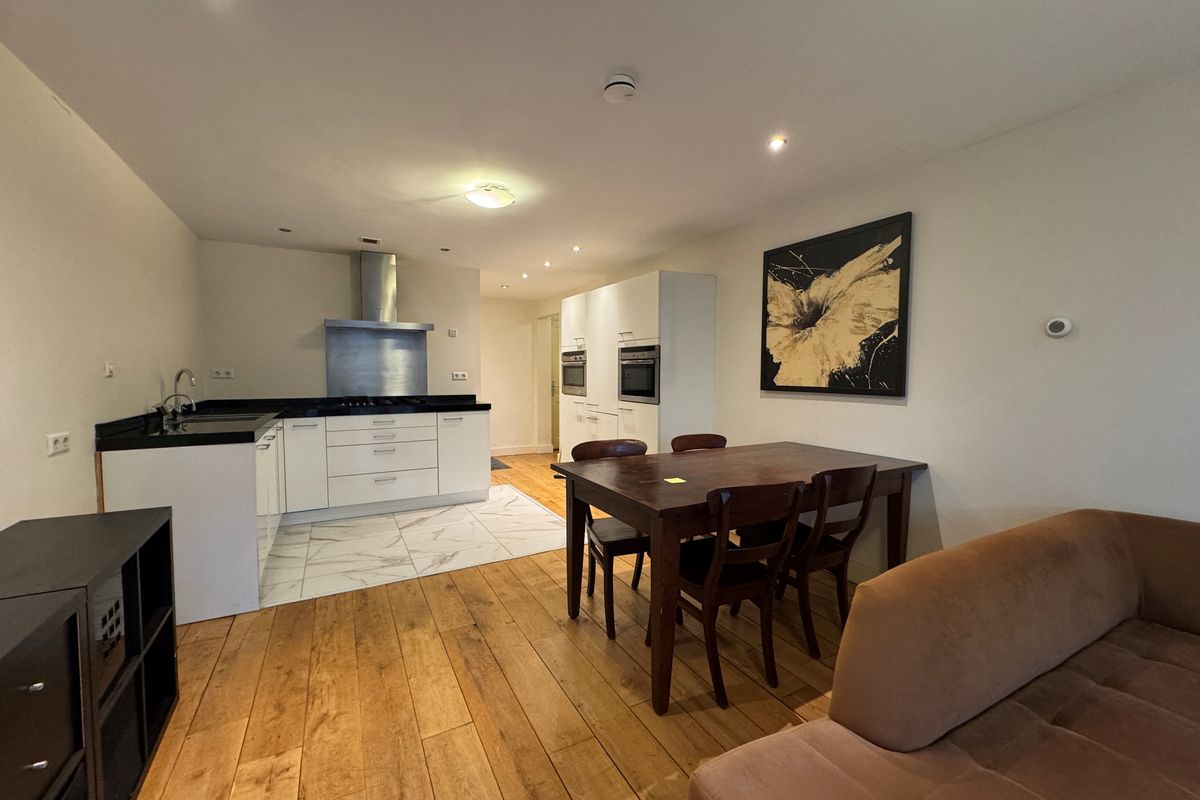 De sfeervolle woonkamer met open keuken vormt een heerlijke plek om te ontspannen na een werkdag. Vanuit de woonkamer toegang tot de tuin middels de dubbele openslaande deuren.