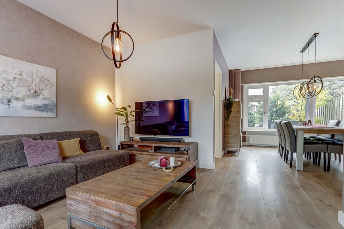 Wat een heerlijke lichte Z-woonkamer! De grote raampartijen aan zowel de voor- als achterzijde zorgen voor volop daglicht en een fijne sfeer. De kamer is netjes afgewerkt met een laminaatvloer, neutrale wandafwerking en een stucwerk plafond. Aan de voorzijde is ruimte voor een gezellige zithoek terwijl aan de achterzijde een eethoek perfect uitzicht biedt op de tuin. Via de woonkamer bereik je bovendien een praktische trapkast, ideaal voor extra voorraad of huishoudelijke spullen.